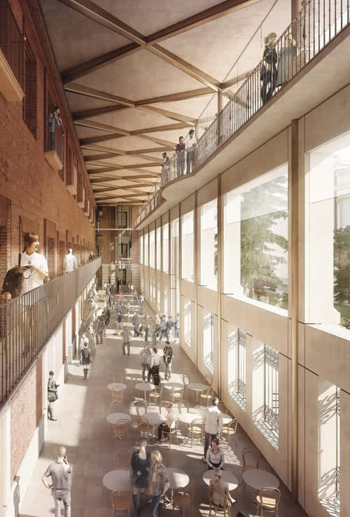 La recuperación de la fachada sur del Palacio pasa por el desmontaje de los forjados que contra ella acometen, generando así entre el lienzo revelado y la fachada actual un espectacular espacio público: el nuevo atrio del Campus del Prado. A través de una delicada intervención de apertura de los huecos de la fachada existente, la luz del día atraviesa este espacio llegando de nuevo al Salón de Reinos, que también recupera su originaria relación con el paisaje.