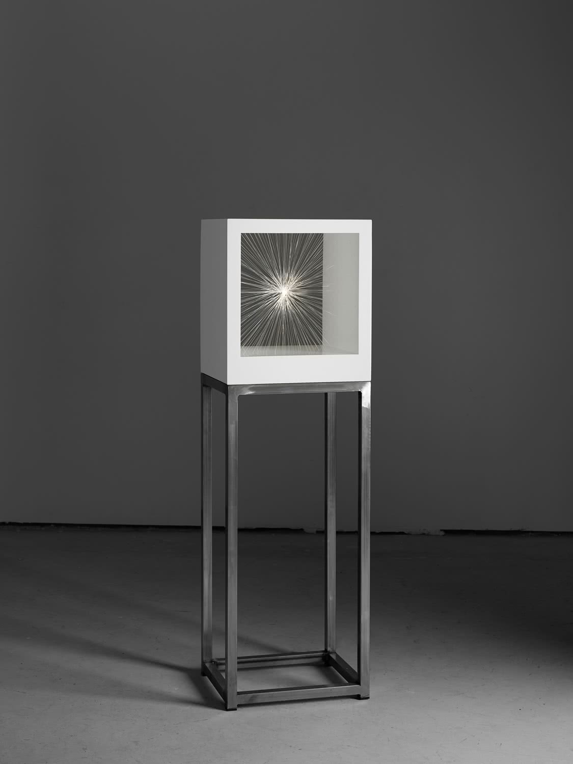 La obra Enana blanca, por ejemplo, representa una explosión estelar, un acontecimiento cósmico fuera del alcance del ojo, que queda congelado de una manera delicada y poética. Los referentes del artista hunden sus raíces en faros intelectuales como Tanizaki, la deconstrucción de la experiencia de Wittgenstein, y la consciencia de la oscuridad presente en la obra de Carl Jung.