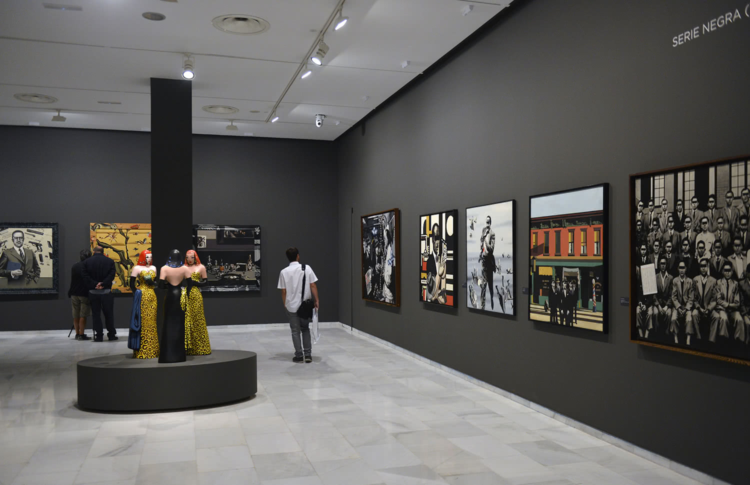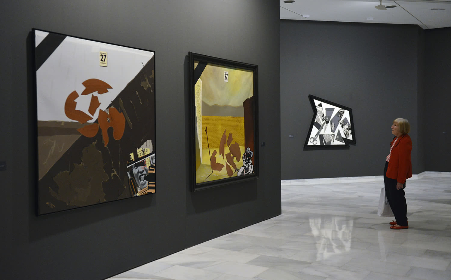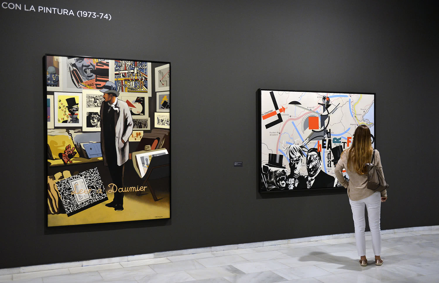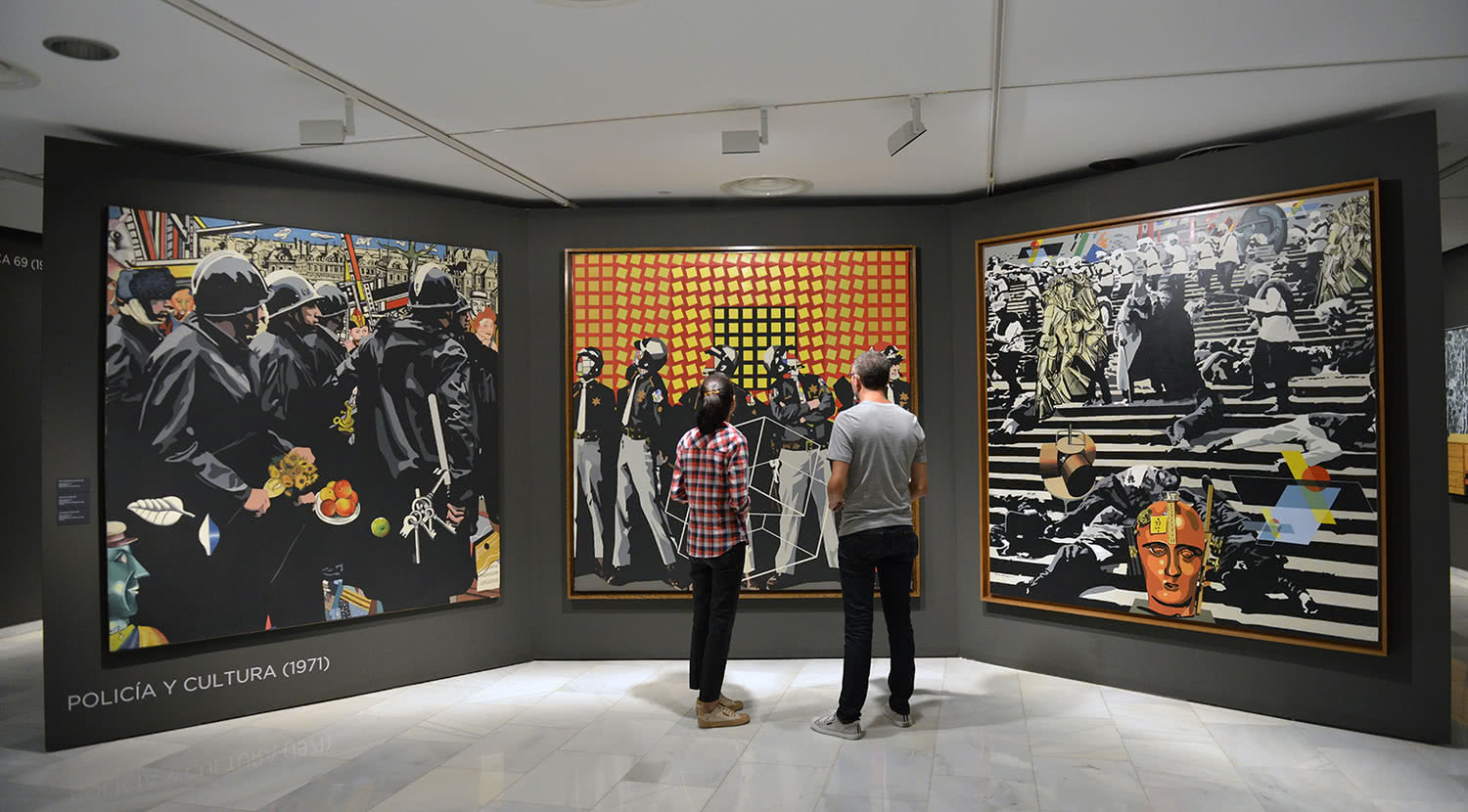 La estructura de esta exposición reproduce la articulación serial decidida por los artistas. La primera serie, La recuperación (1967-68), alude a la utilización que el régimen franquista hizo de la pintura española del Siglo de Oro: Guernica 69 (1969) ironiza con el proyecto del Gobierno español de recuperar el cuadro de Picasso, custodiado en el MoMA; por otro lado, Autopsia de un oficio (1970) aborda la actividad del pintor nutriéndose de la iconografía de Las Meninas, mientras Policía y cultura (1971) trata la ambigüedad de las vanguardias artísticas ante las realidades de la represión política. La pintura, entendida como un mundo aparte regido por sus propias reglas, es el tema de la Serie negra (1972), que se inspira en el cine negro.