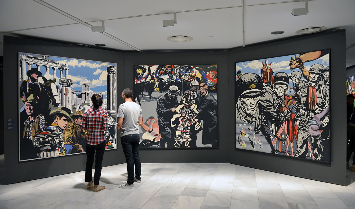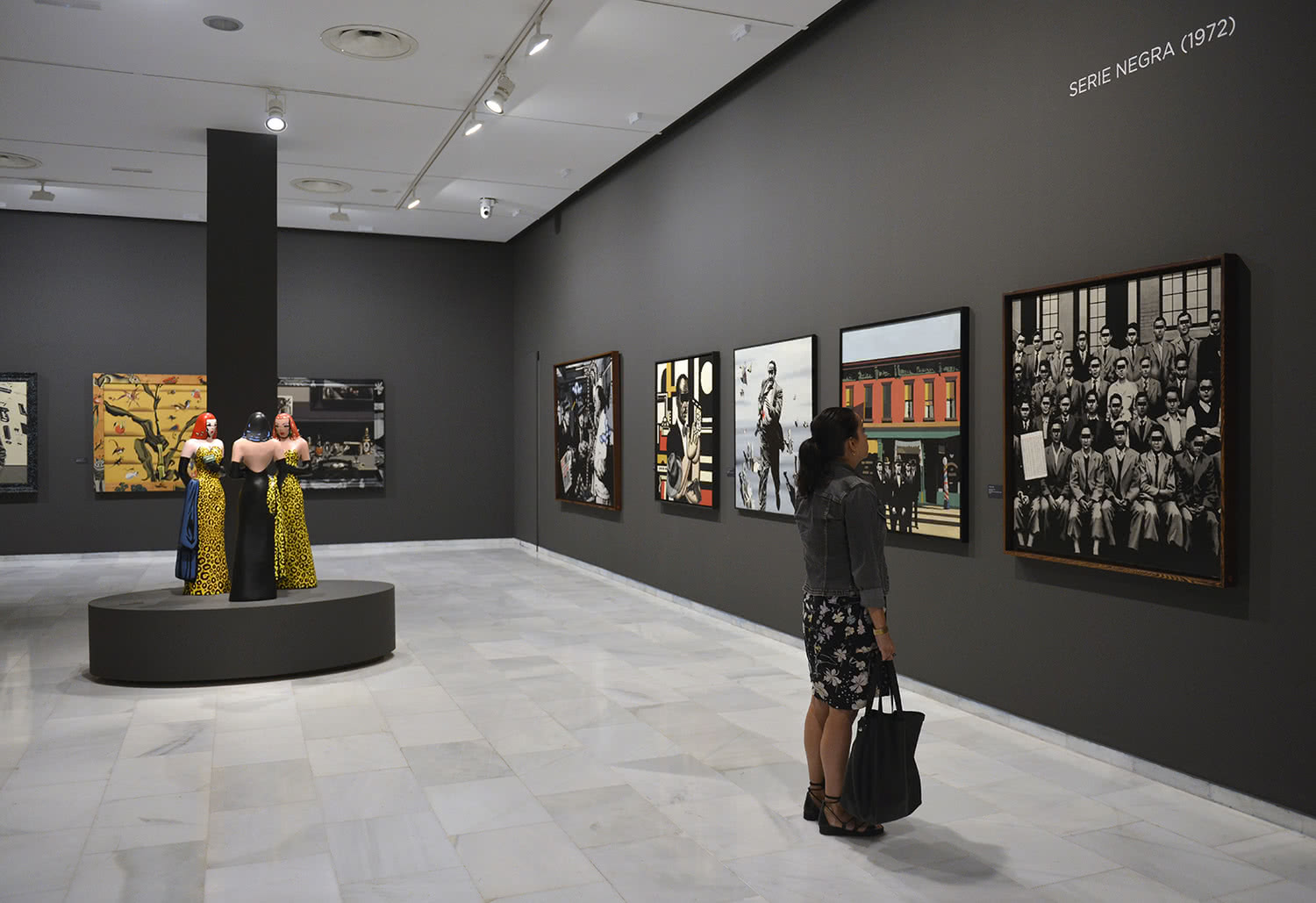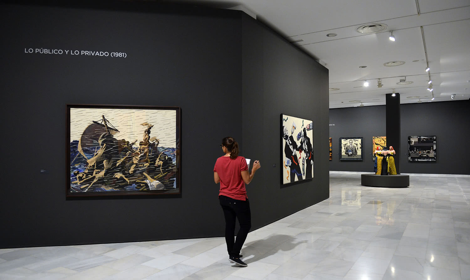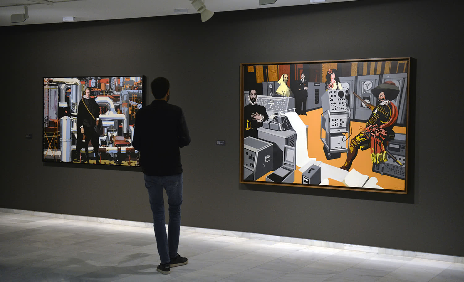 La estructura de esta exposición reproduce la articulación serial decidida por los artistas. La primera serie, La recuperación (1967-68), alude a la utilización que el régimen franquista hizo de la pintura española del Siglo de Oro: Guernica 69 (1969) ironiza con el proyecto del Gobierno español de recuperar el cuadro de Picasso, custodiado en el MoMA; por otro lado, Autopsia de un oficio (1970) aborda la actividad del pintor nutriéndose de la iconografía de Las Meninas, mientras Policía y cultura (1971) trata la ambigüedad de las vanguardias artísticas ante las realidades de la represión política. La pintura, entendida como un mundo aparte regido por sus propias reglas, es el tema de la Serie negra (1972), que se inspira en el cine negro.