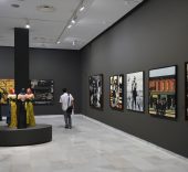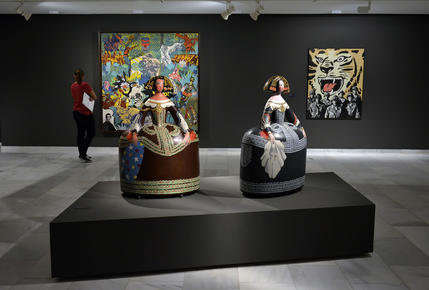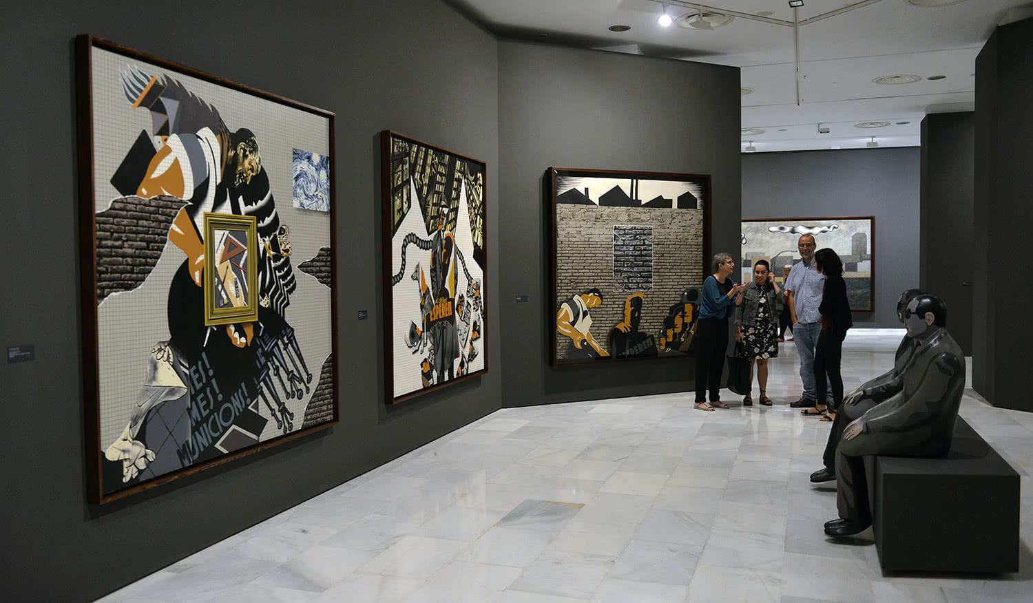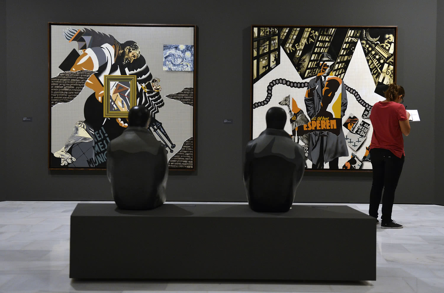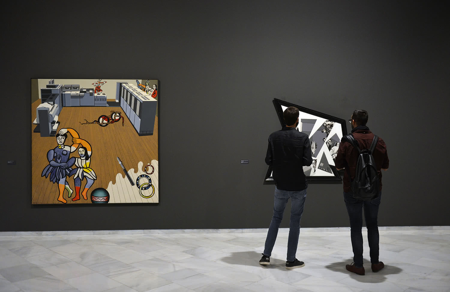 La estructura de esta exposición reproduce la articulación serial decidida por los artistas. La primera serie, La recuperación (1967-68), alude a la utilización que el régimen franquista hizo de la pintura española del Siglo de Oro: Guernica 69 (1969) ironiza con el proyecto del Gobierno español de recuperar el cuadro de Picasso, custodiado en el MoMA; por otro lado, Autopsia de un oficio (1970) aborda la actividad del pintor nutriéndose de la iconografía de Las Meninas, mientras Policía y cultura (1971) trata la ambigüedad de las vanguardias artísticas ante las realidades de la represión política. La pintura, entendida como un mundo aparte regido por sus propias reglas, es el tema de la Serie negra (1972), que se inspira en el cine negro.