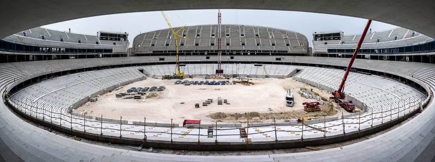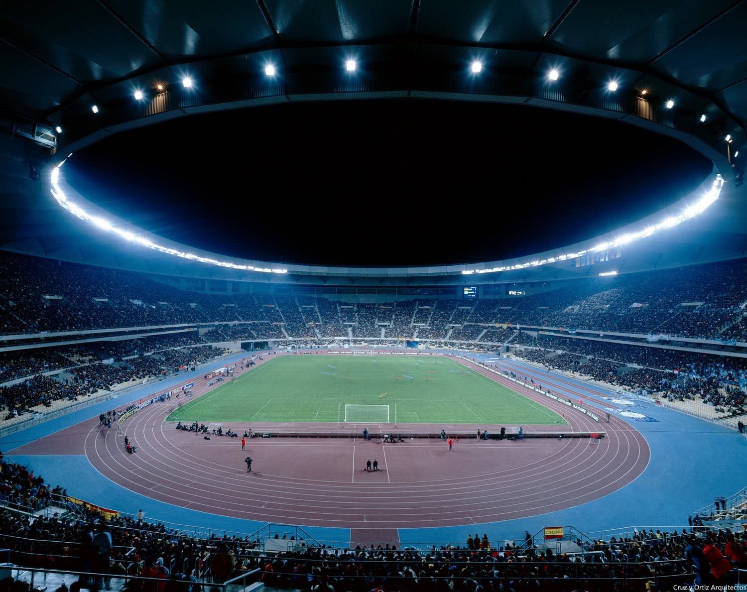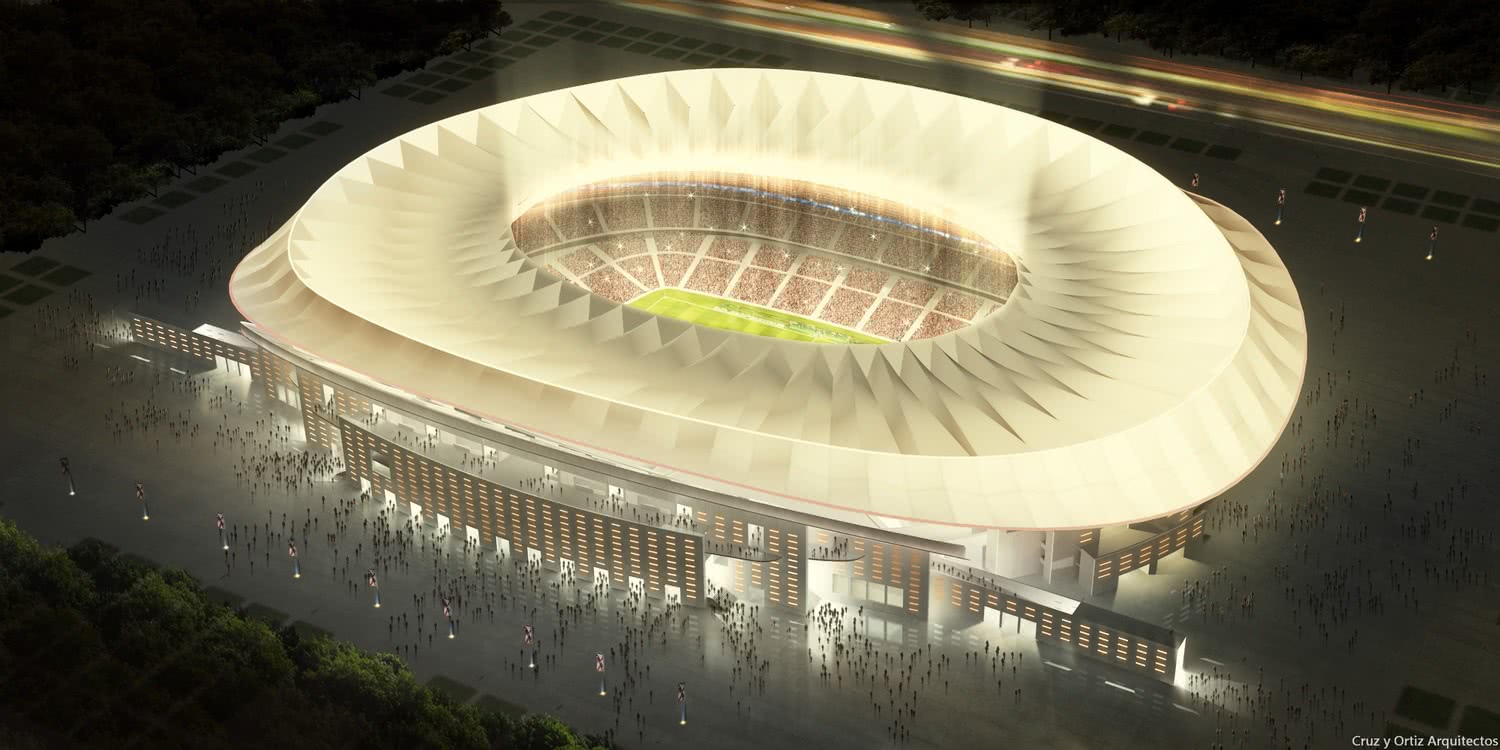 La muestra dedica especial atención al primero. El nuevo estadio para el Atlético de Madrid se inaugurará el próximo mes de agosto como sede del club de fútbol. Desde su concepción inicial como estadio de atletismo hasta su conclusión han transcurrido 30 años, lo que lo convierte en la obra con la trayectoria temporal más extensa del estudio. En palabras de Antonio Cruz, el proyecto de un estadio requiere un programa muy complejo, «pero el edificio del Atlético de Madrid es más difícil por el hecho de que procede de un edificio ya construido. Queremos que el edificio inicial todavía sea reconocible pero al mismo tiempo queremos que ambos edificios, tanto el inicial como lo que añadimos ahora, constituyan un conjunto armónico. Hay que ser fieles a lo que acabamos en el año 1994 y al mismo tiempo que no se conciba como la suma de dos proyectos distintos».