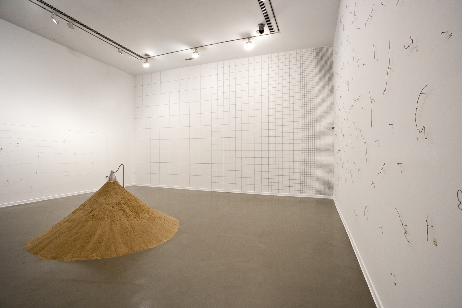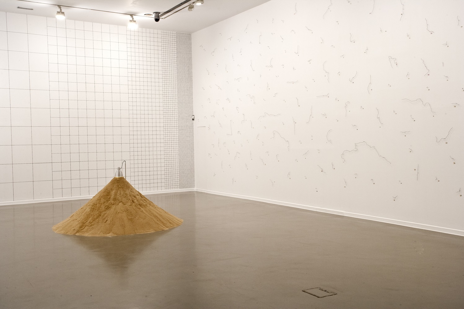 Las piezas que forman la muestra responden a esa lógica del dibujo a la que tantas veces se ha referido Robbio, desde la titulada Discurso, una cuadrícula a gran escala realizada directamente sobre pared, en alusión al orden que simbólicamente ésta representa; pasando por la instalación titulada Plano expandido (cuestiones al trazar una línea), formada por 319 líneas realizadas en alambre sobre el muro que, a modo de rayas sinuosas, simbolizan perfiles de fronteras.