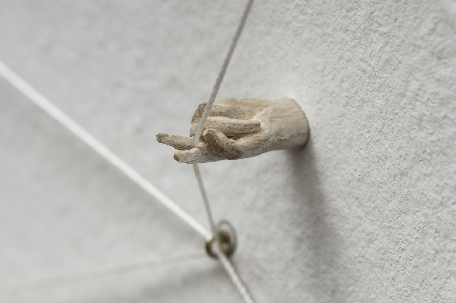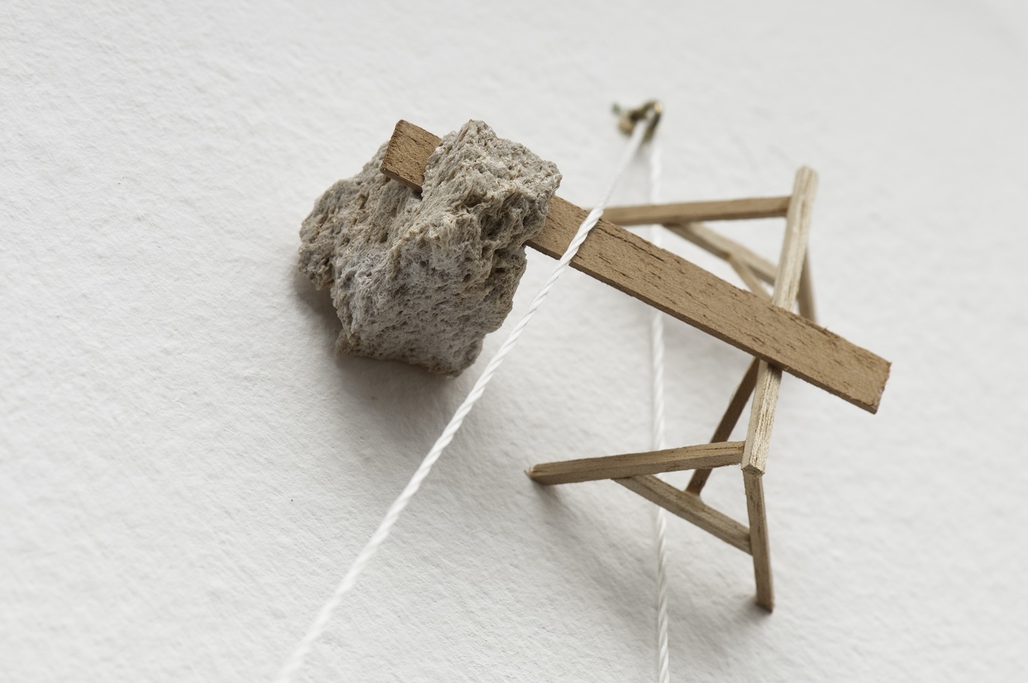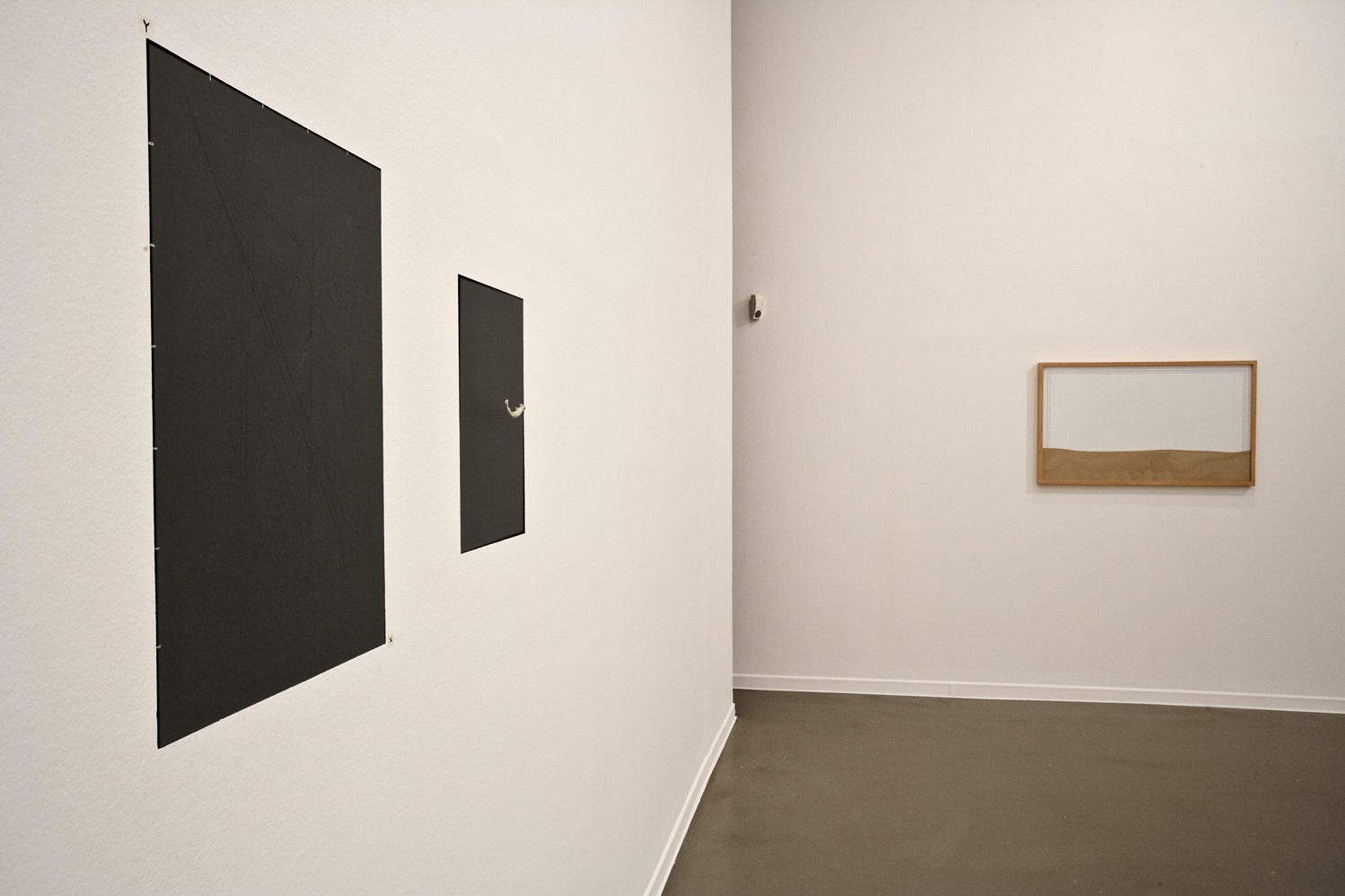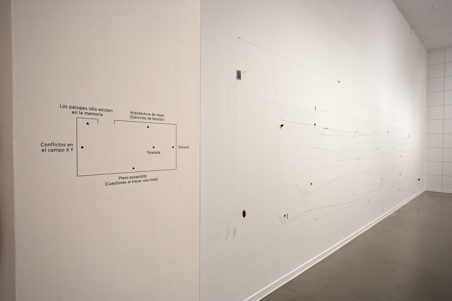 La relación entre los diferentes elementos permite construir un tipo de arquitectura donde los elementos dispuestos y la estructura de cuerda que los sostiene se vinculan a la forma física y también a la simbólica. Otra de las piezas que se puede ver en la muestra es la titulada Conflictos en el campo Y-X, en la que el artista realiza incisiones a modo de rayas sobre una superficie de pizarra, dejando los surcos y destruyendo la función del encerado. De este modo reconstruye la funcionalidad del objeto.