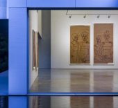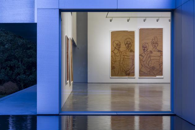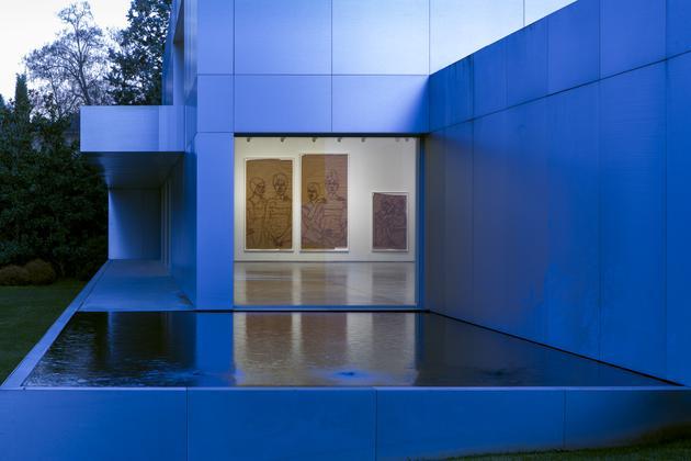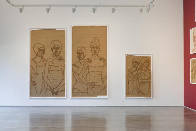 Estos dibujos de contornos perforados son testigos de su única función como materiales de trabajo. En cada cartón establece las líneas básicas de la composición antes de transferirla a un lienzo del mismo tamaño y transformarla en los deslumbrantes colores que caracterizan su pintura. Aunque el cartón es una directriz preliminar, parte del proceso de creación de una pintura, él lo ve como un documento acabado, con un mensaje artístico propio: retratos estructurados de forma plana en lo relativo a los efectos de luz y volumen, composiciones en las que la técnica le fuerza a una reducción a unos pocos detalles y superficies, en las que la resonancia del espacio vacío en el papel es comparable a la de las zonas monocromas de sus pinturas, como se puede comprobar en los lienzos incluidos en la exposición.