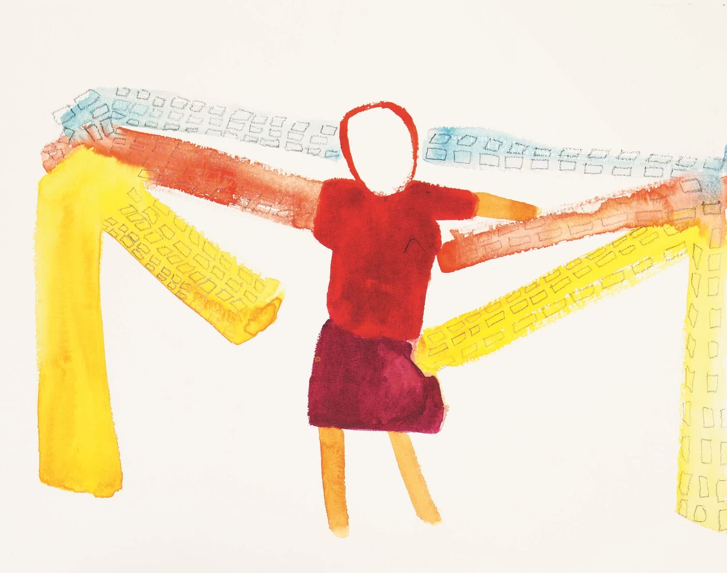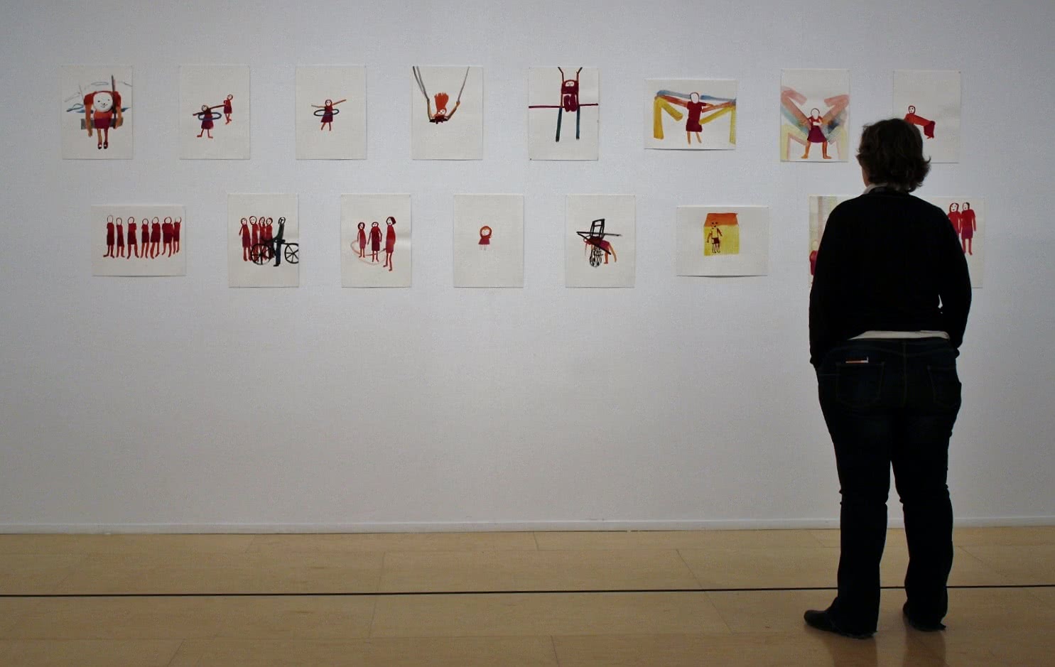 En el imaginario de la artista la línea es el enunciado elemental con el que construye un relato autobiográfico que está siempre presente en su obra. Su trazo sencillo remite a una escritura gestual, similar a las anotaciones espontáneas e íntimas de un diario. Consigue de ese modo estructurar un enigmático repertorio de personajes, figuras, animales y objetos que se desarman y rearman en fragmentos, para acabar proyectándose en situaciones cotidianas.