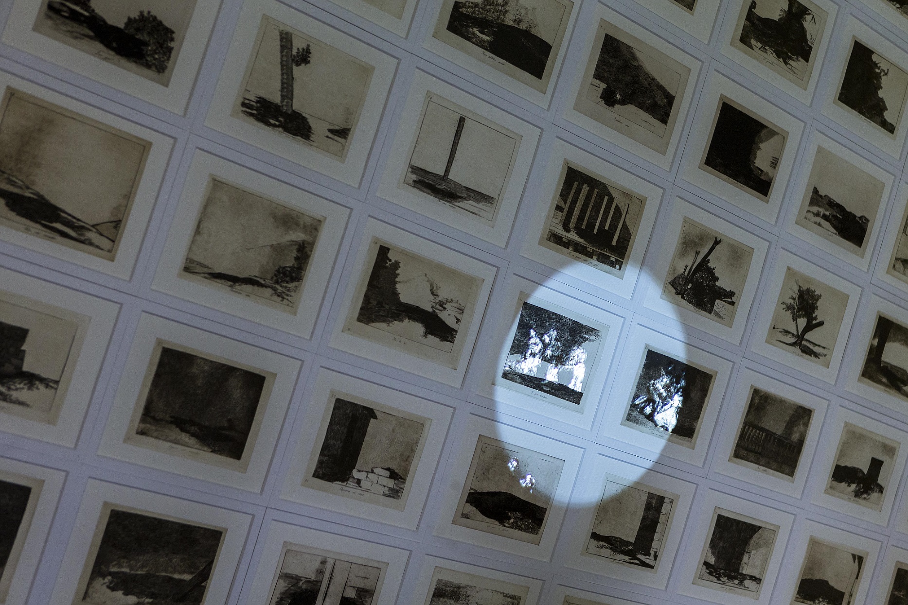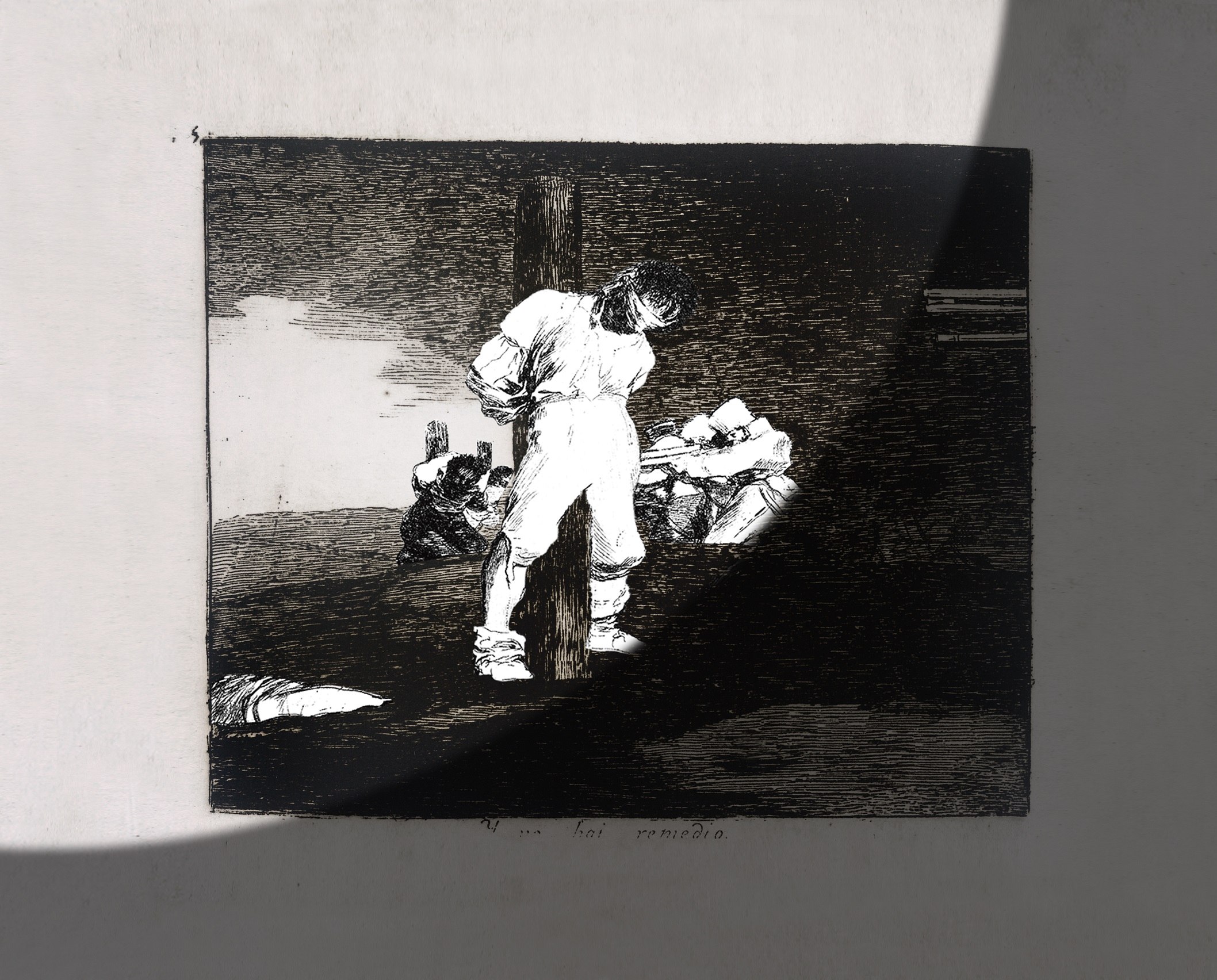 Comisariada por Ana Martínez de Aguilar, en esta obra, Farideh vacía de figuras y reelabora las estampas de esta icónica serie para mostrarlas acompañadas por las imágenes que han sido previamente animadas y que ahora se proyectan con un foco de luz en movimiento. Para ello, la artista manipula cuidadosamente cada grabado extrayendo las escenas y reelaborando los huecos dejados por las figuras. Así deja los fondos como escenarios vacíos y los coloca en un rectángulo formado por ocho líneas superpuestas de 10 fotograbados cada una.