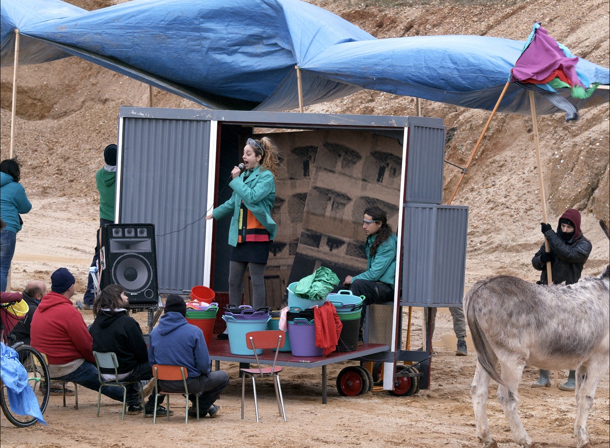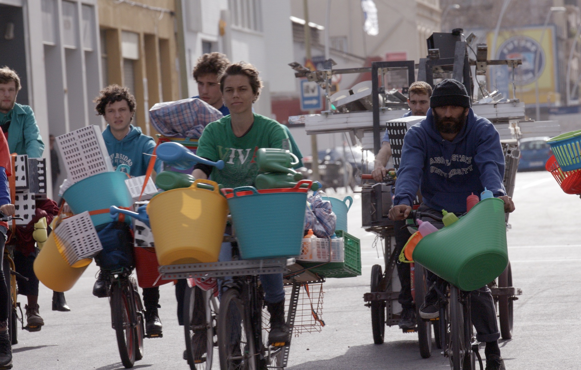 Estos decorados o escenarios marcados por la pobreza de recursos son manipulados y accionados como manifiestas indefiniciones de una ciudadanía que se declara fronteriza, móvil e inestable. A medio camino entre pabellón portátil y carromato vagabundo, un cacharro ambulante liga los diferentes espacios recorridos para concitar un Babel kafkiano, donde el movimiento nomádico es también una conmoción en el lenguaje, un desplazamiento vernacular que declina y traduce las faenas de esa comunidad desterritorializada.