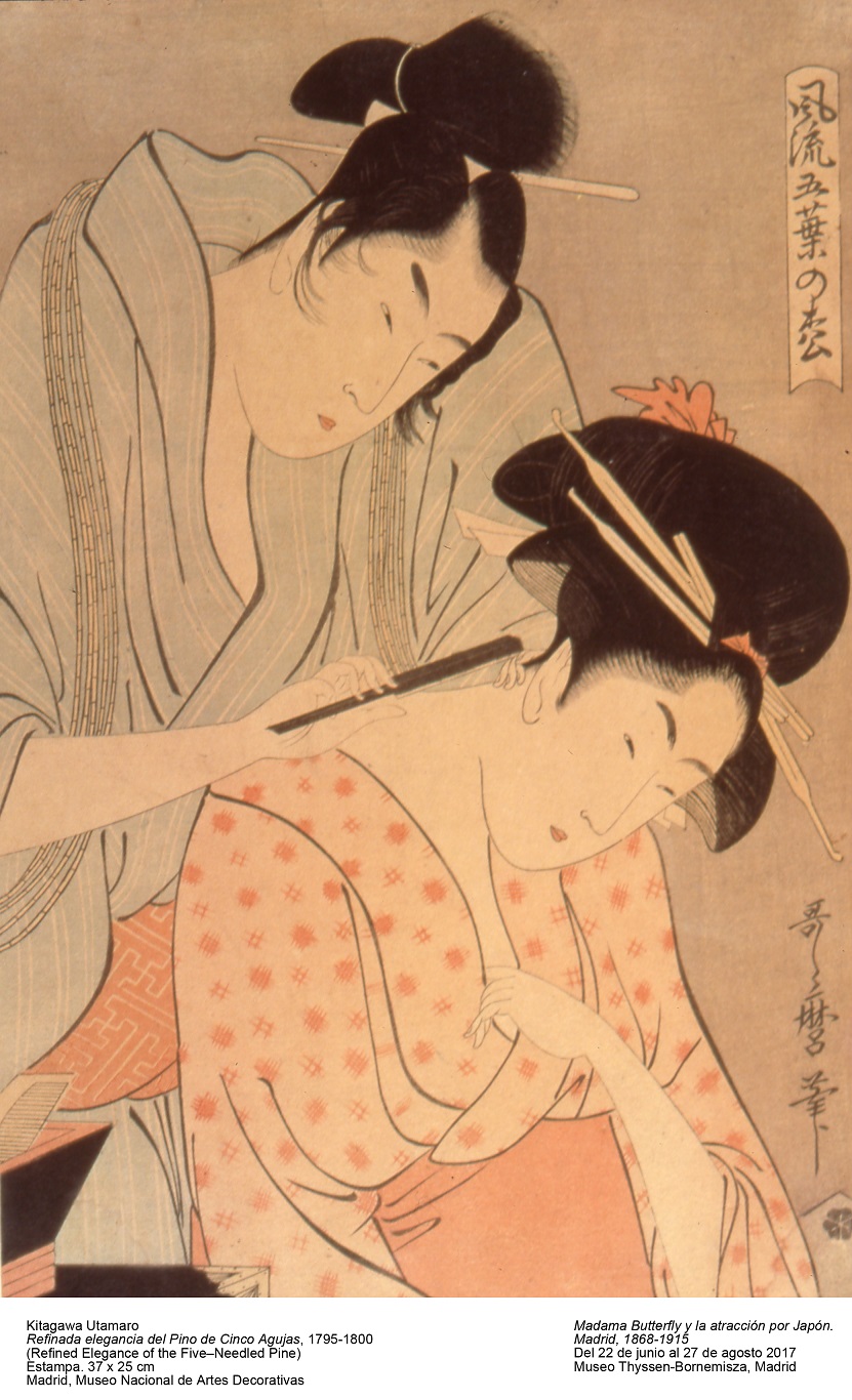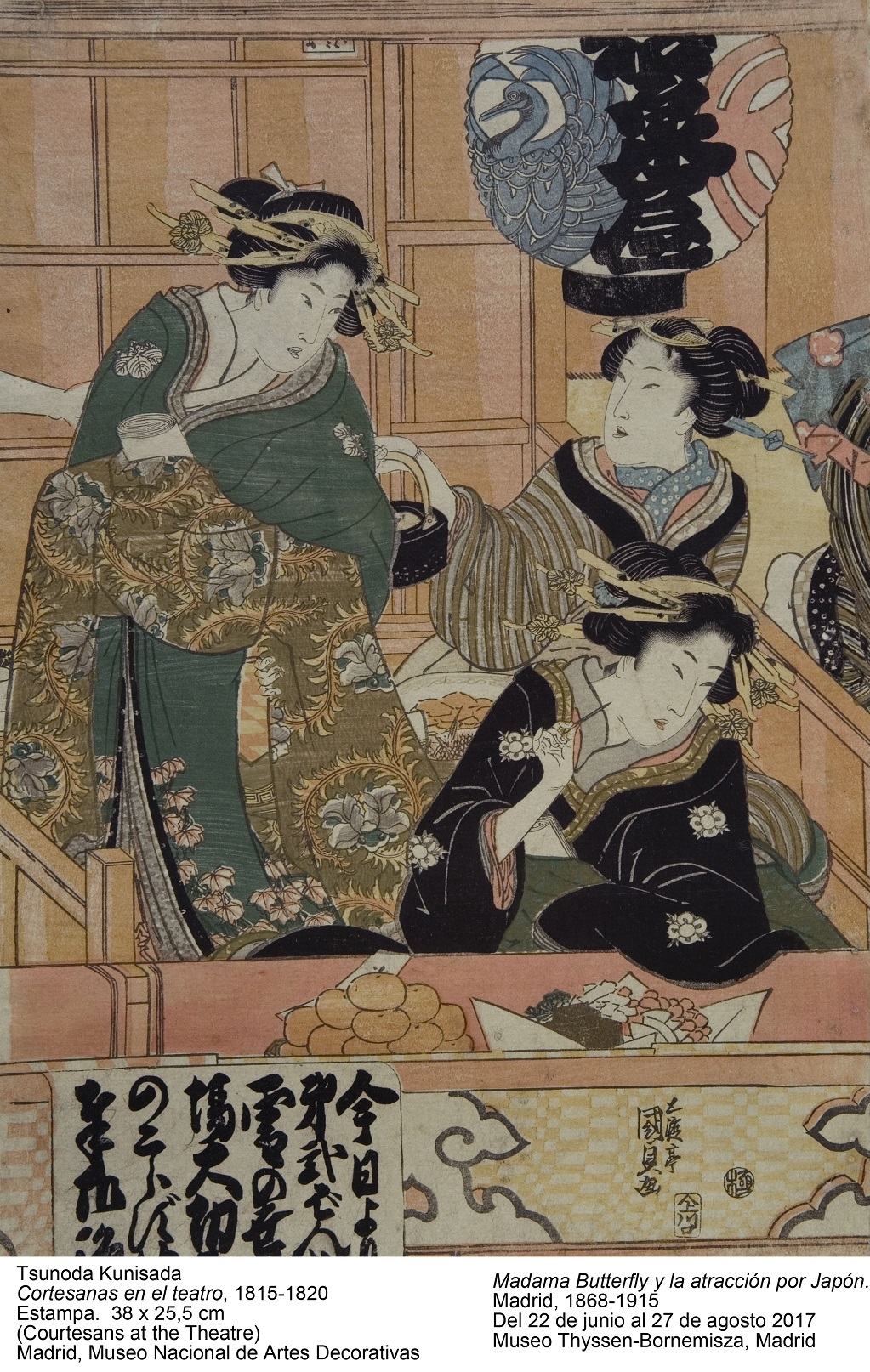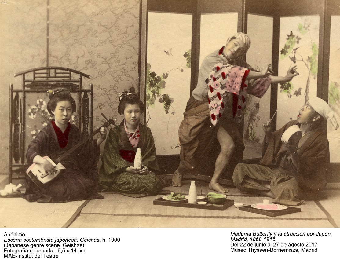 Pero, sin duda, uno de los hitos principales del japonismo madrileño fue el estreno de la ópera de Giacomo Puccini en noviembre de 1907. Precedida de su gran fama internacional fue bien acogida por el público en una época en la que las noticias sobre el país nipón todavía eran escasas. En la muestra se exhiben, entre otros objetos, el programa de mano y la adaptación al español de la obra, además de una serie de siete figurines realizados por Joaquín Xaudaró para la representación.
