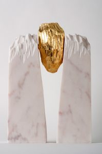 El trabajo escultórico de Carmen Baena configura espacios determinados por el equilibrio y la serenidad. Más allá de la irregular topografía que describe la superficie de sus composiciones, en ellas hay un orden al que contribuye la pureza y luminosidad del blanco que proyecta la piedra utilizada. Es recurrente en el trabajo de la artista una sutil transición entre el perfil pulido del mármol y las superficies complejas, cinceladas a golpe de puntero, resueltas a través de una iconografía que imita territorios montañosos.