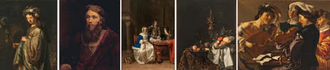 De izquierda a derecha: Rembrandt van Rijn, Flora, 1634; Rembrandt van Rijn, Portrait of a Man, 1661; Gabriël Metsu, Breakfast, c 1659–62; Willem Kalf, Stillife with dessert, c. 1653/54; Dirck van Baburen, Concert, 1623. © State Hermitage Museum, St Petersburg.