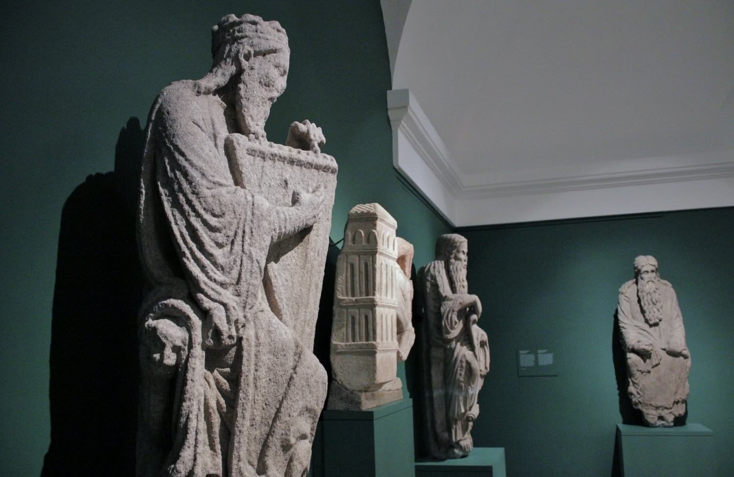 Maestro Mateo muestra esculturas reunidas de nuevo desde la desaparición de la fachada mateana del Pórtico de la Gloria. En especial destaca la figura masculina con cartela, descubierta el pasado mes de octubre durante las obras de restauración de la Torre de las Campanas (torre sur de la catedral). Este hallazgo ha supuesto un avance extraordinario en el conocimiento de la actividad compostelana del Maestro Mateo; o las esculturas de David y Salomón.