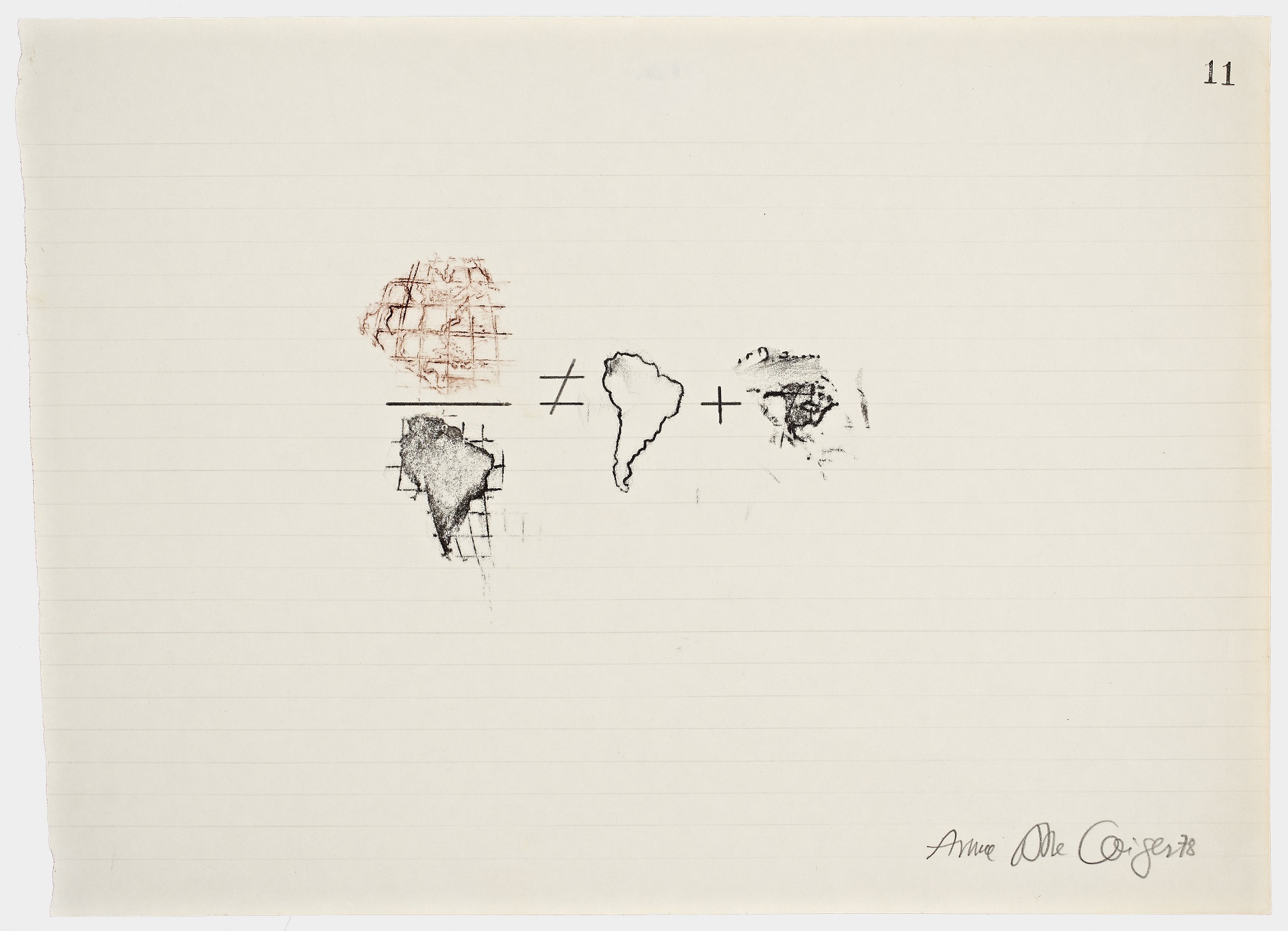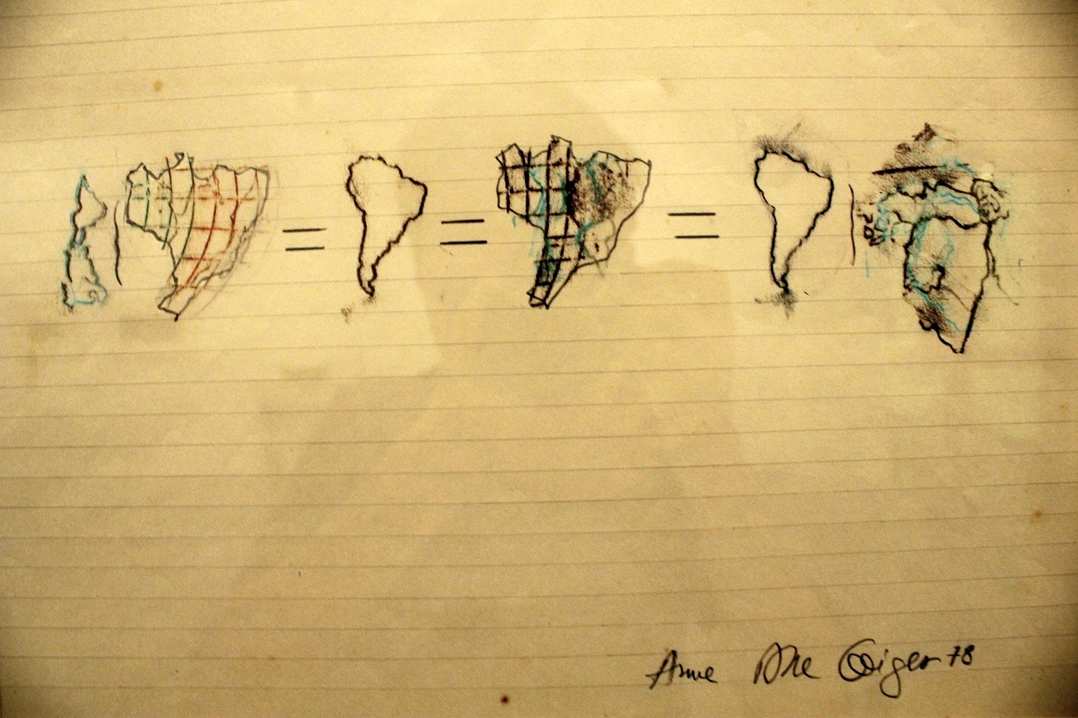 En palabras de Estrella de Diego, “dibujar un mapa es trazar los esquemas del poder». Anna Bella Geiger dibuja mapas, territorio históricamente asignado a los hombres, en tanto concepción espacial para revisar el concepto político de dicho espacio. Con este planteamiento aspira a que las mujeres recuperen ese territorio que les ha sido negado y se pregunta cuántos mapas hay que subvertir para dar la vuelta a la narración y empezar a contar de nuevo.