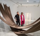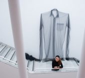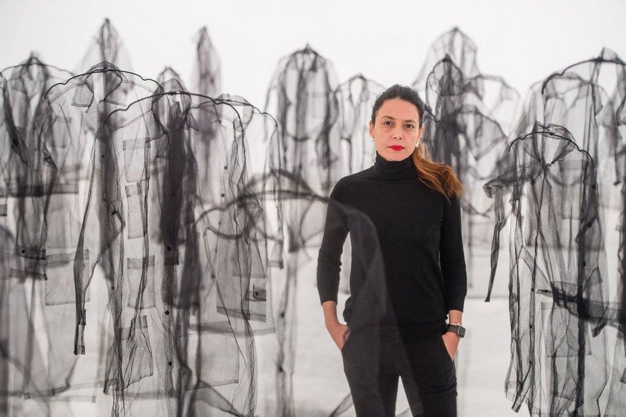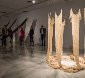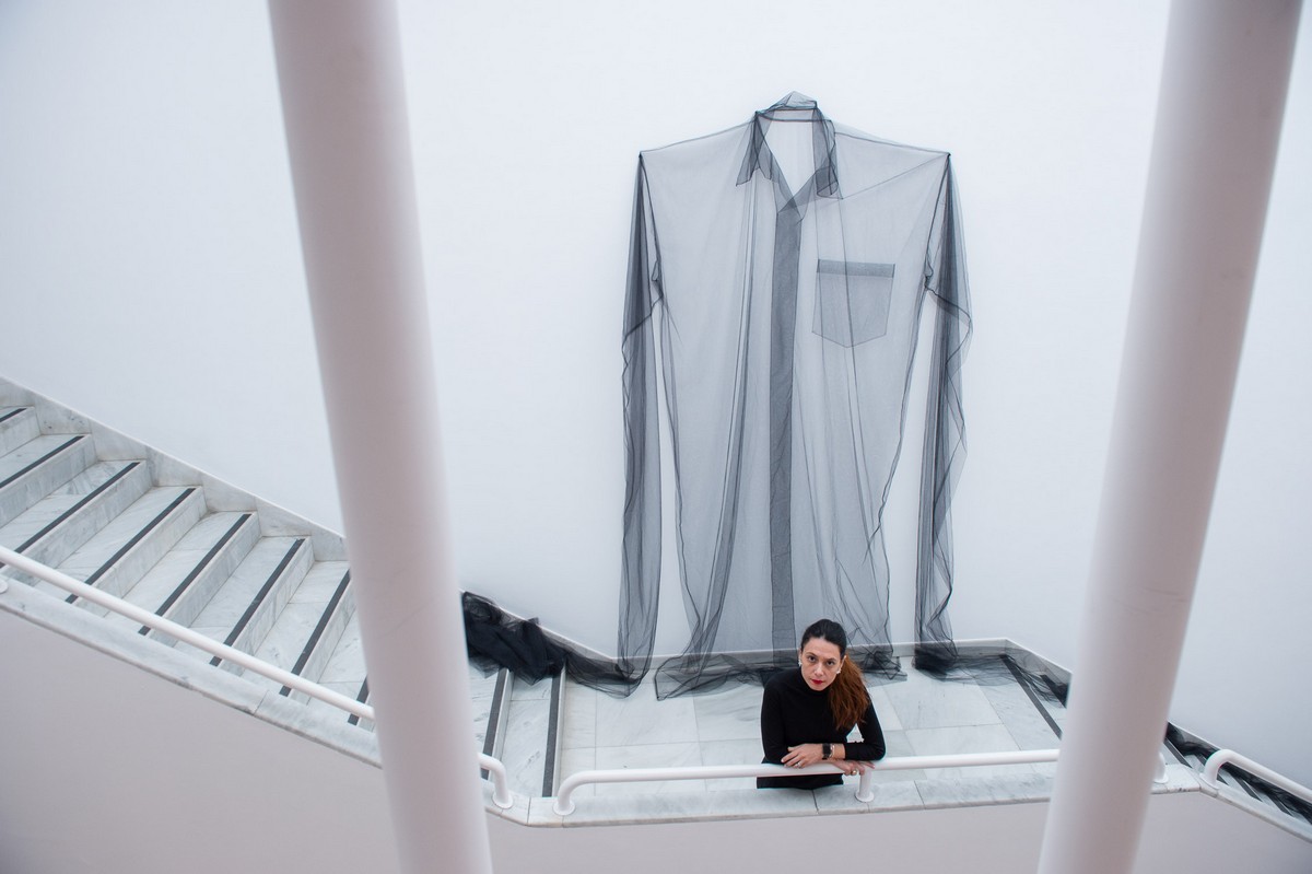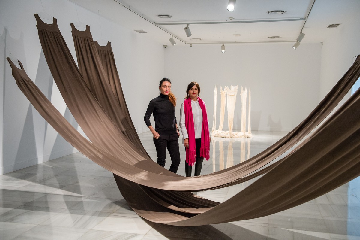 El empleo del tul se ve reflejado en obras como Uniforme, 2008, o El abrazo, 2017, que forman parte destacada de la exposición. En todo caso, la artista trabaja también con tejidos de algodón artesanal y vincula sus piezas a discursos sobre la colonia, el cuerpo femenino y el patriarcado. El hilado y el tejido son el sustento principal de muchas de las mujeres de su país, que no sólo lo han usado para su propia vestimenta sino que también lo comercializaban.