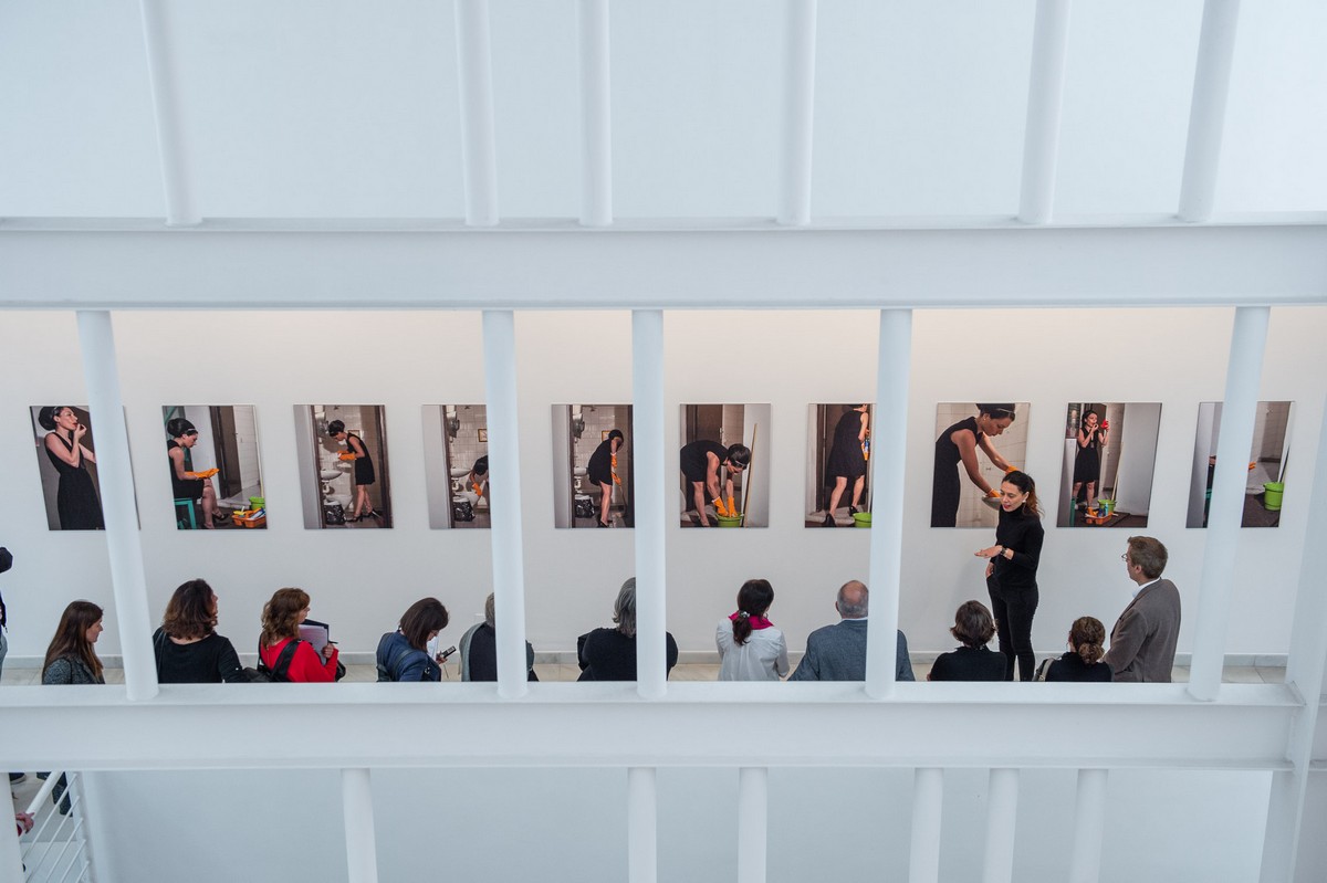 La exposición incluye también el registro fotográfico de su performance Después de vos, 2007, en la que aparece muy elegante vestida, peinada y maquillada haciendo la limpieza de baños de un bar en Asunción. Es una pieza que trabaja la cuestión de la labor doméstica, asignada históricamente a la mujer.