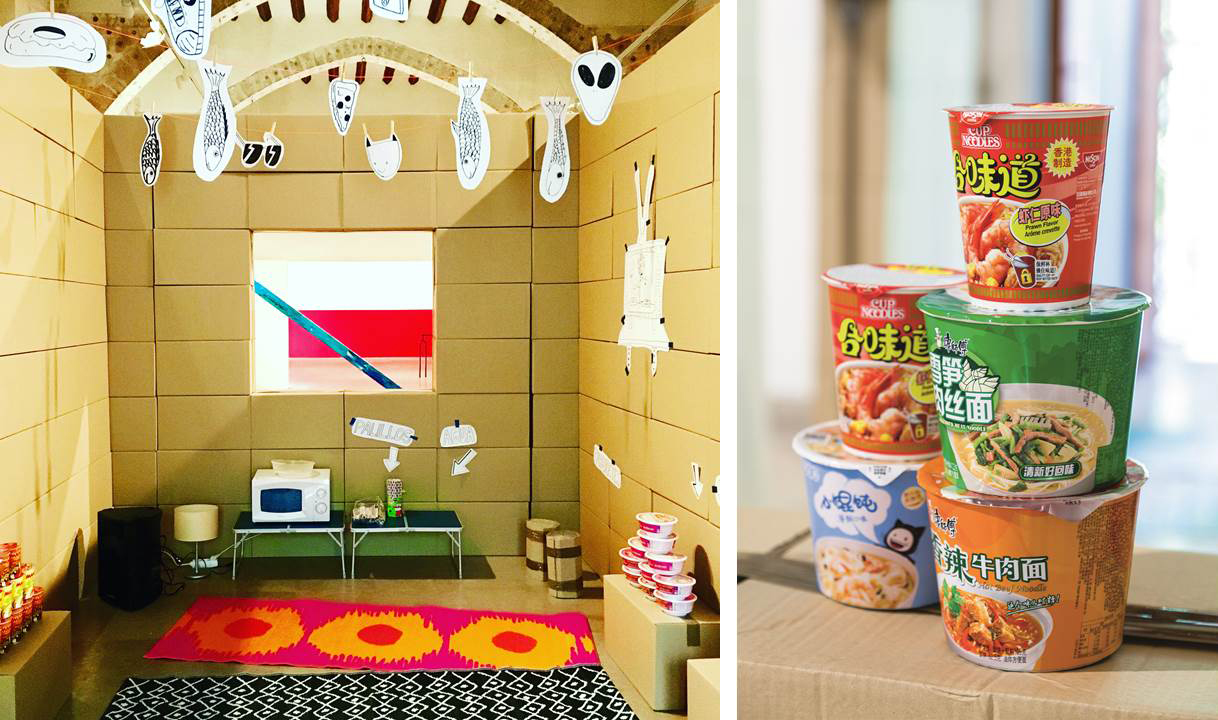 Con esta intencionalidad tan irónica, que ya se pudo ver anteriormente en sus últimas pinturas y dibujos –unas obras cargadas de un mensaje detonador de corrientes contraculturales y contra mercantiles “Soft” difuminadas por la risa–, transforma el espacio de la galería en un tenderete de noodles, trayendo de vuelta las nociones rebeldes de la segunda mitad del siglo XX.