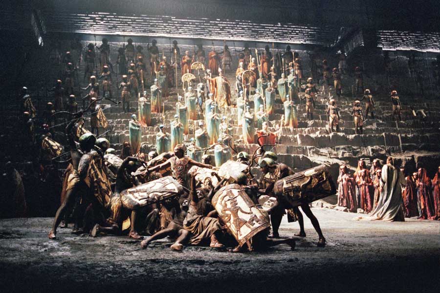 Es precisamente esta dualidad entre la espectacularidad de las escenas de masas –con el imperio egipcio, ejércitos, faraones, esclavos, sacerdotisas, invasores, prisioneros, ritos religiosos, celebraciones, etc.– y aquellas, recogidas, en las que afloran los conflictos y dramas de los protagonistas, donde radica la dificultad de la puesta en escena de Aida. Hugo de Ana opta por una producción de fuerte poder simbólico, dominada por una colosal pirámide que sugiere la magnificencia del poder político y religioso, contrapuesta a paisajes desérticos que enfatizan la profunda soledad de los personajes, que se debaten entre sentimientos, dudas y contradicciones. Para la actual reposición de Aida, De Ana ha revisado la producción original de 1998, actualizando elementos escenográficos y parte del vestuario e introduciendo algunas proyecciones.