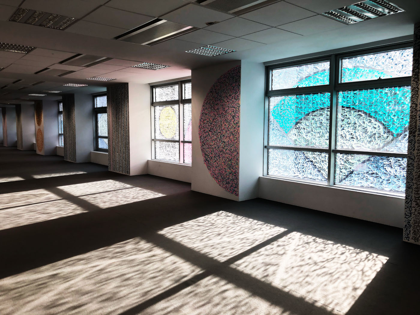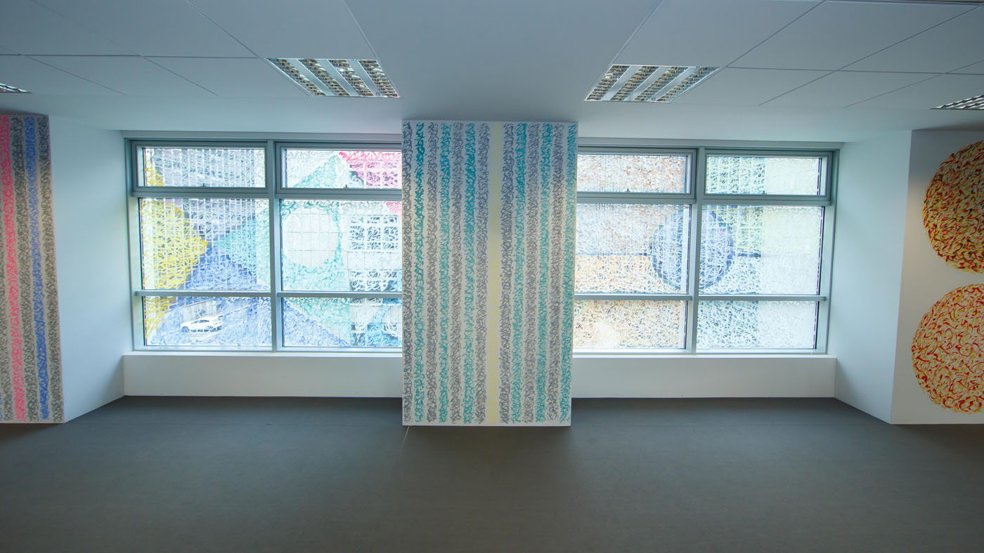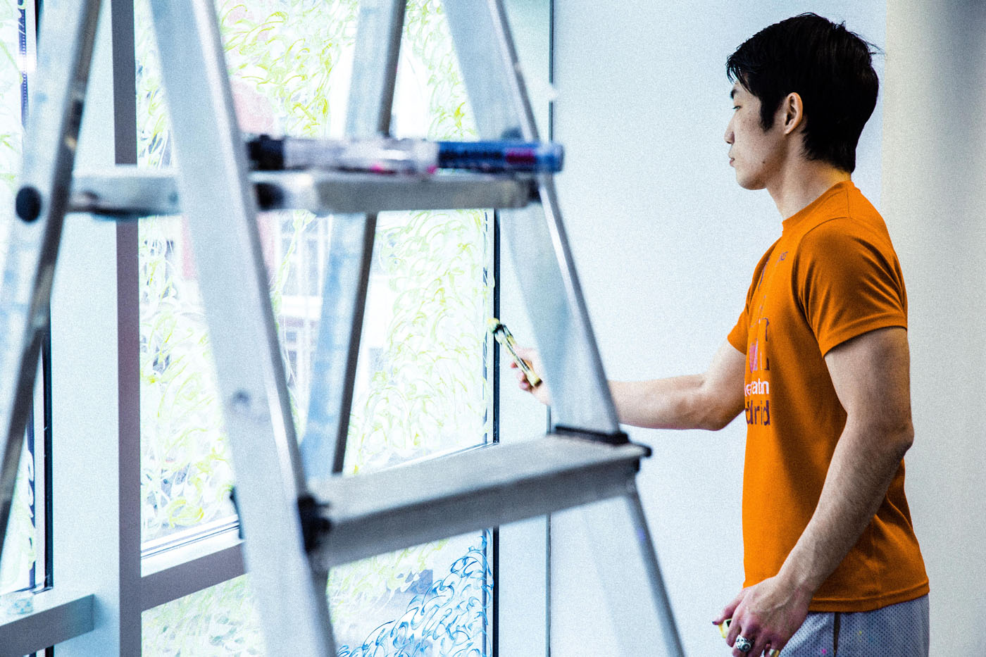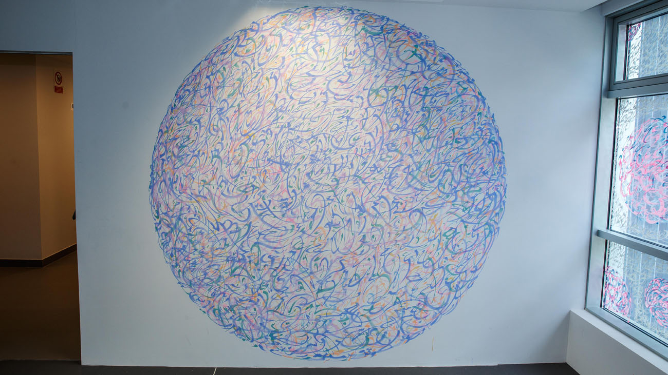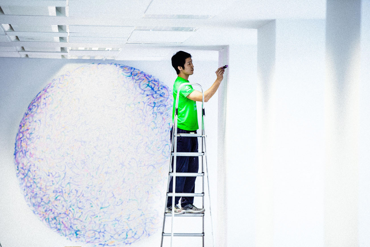 Durante la Humanity Week, celebrada en abril en el IE, el artista creó una obra de 60×60 cm basada en un concepto: felicidad. La universidad la mostró a 500 de sus alumnos y profesores de más de cien países que eligieron aquellas palabras que les inspiraba la obra. Después, Hasegawa las juntó y concibió un concepto más grande que se plasmó en 10 ventanas, nueve columnas y una pared de una planta completa del Instituto. Cada ventana tiene su número propio (1~10), y las columnas hacen de transición entre una y otra. En cuanto a la pared, representa todos los procesos, conceptos y palabras del proyecto.