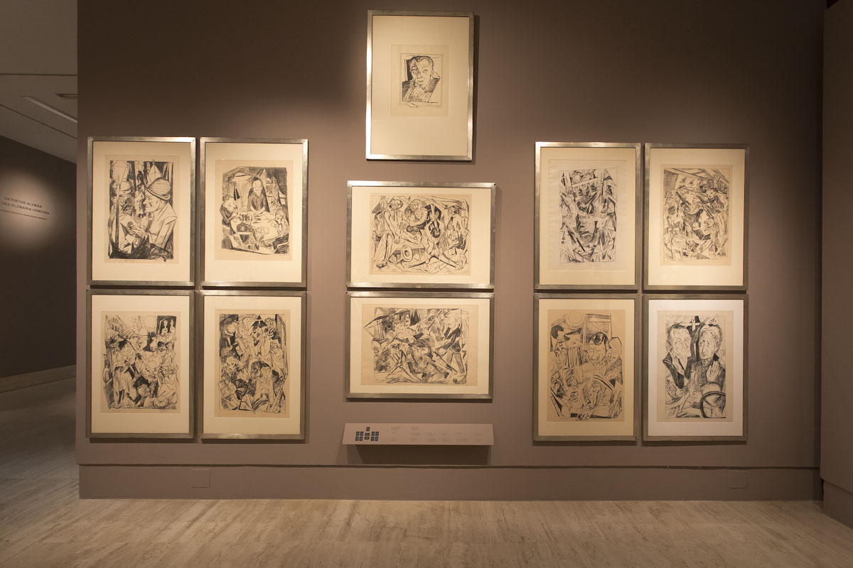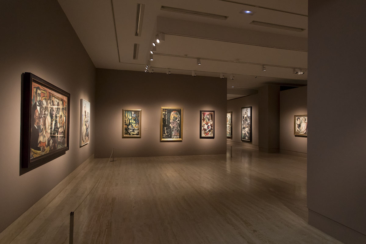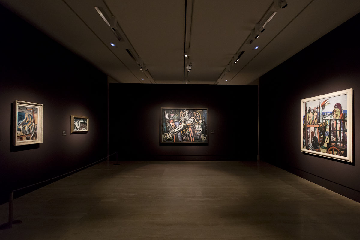 Para Llorens, la presentación, la representatividad e importancia en el conjunto de la producción del artista ha sido el principal criterio de selección de las obras reunidas en esta sección. En la segunda, más extensa y que recorre los años en Ámsterdam (1937-1947) y Estados Unidos (1947-1950), donde vivió tras verse obligado a abandonar Alemania, la elección de las piezas se ha realizado según un criterio temático: el exilio, tanto en sentido literal, por la propia experiencia vital de Beckmann, como figurado, por el significado que tuvo para él como condición básica de la existencia humana en general y del hombre moderno en particular. Por este motivo, los cuadros alegóricos –a los que dedicó mayor esfuerzo y tiempo de trabajo (todos los trípticos y lienzos de gran formato que pintó son composiciones alegóricas)– son los más abundantes en esta selección.