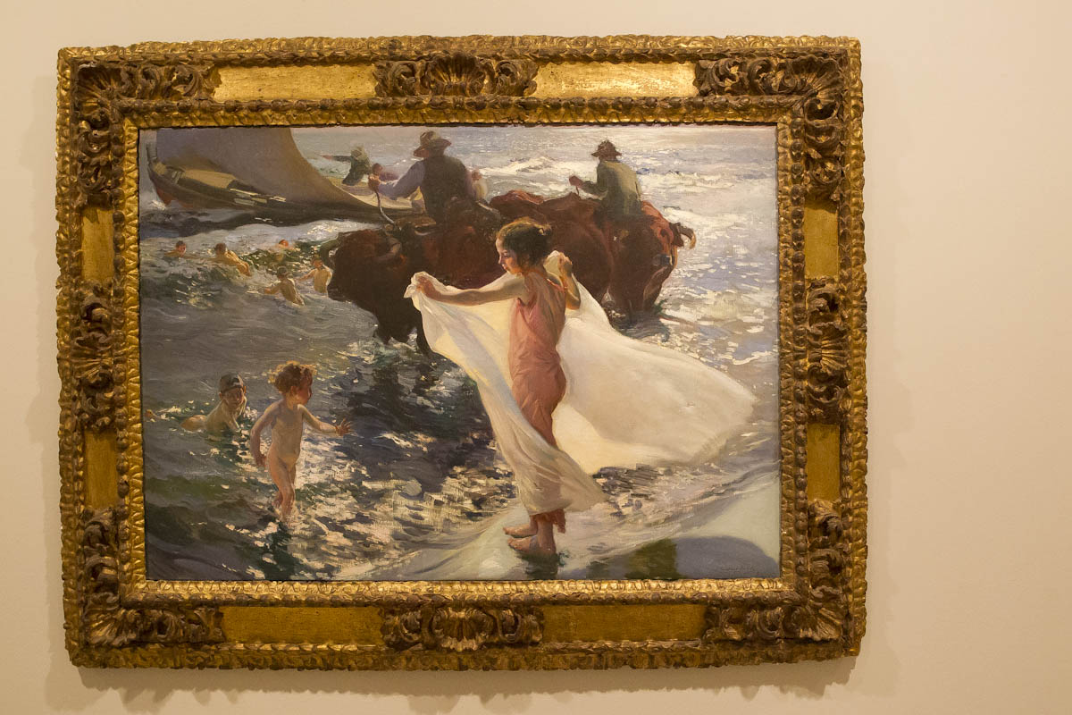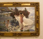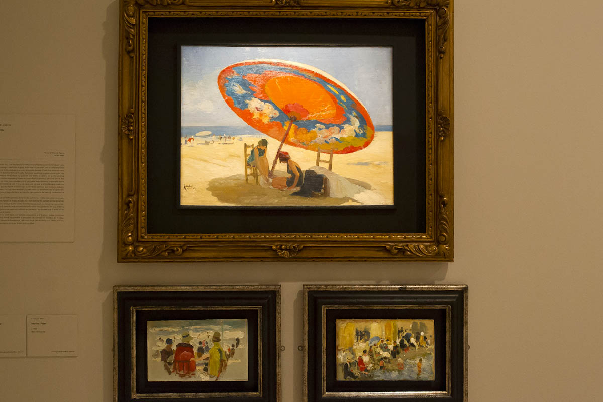 El recorrido de la exposición comienza con la sección España, donde el litoral es, en ocasiones, un lugar para el trabajo pero sobre todo un espacio para el placer, el baño y el juego, escenarios muy habituales en las obras de artistas como Joaquín Sorolla, Cecilio Pla o Ignacio Pinazo.