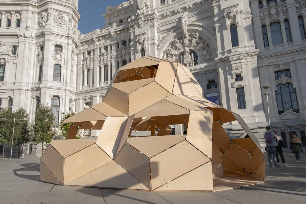 Finalmente, en el exterior del edificio, el colectivo Basurama y Dagoberto Rodríguez, cofundador del colectivo Los Carpinteros, colaboran por primera vez en la realización de un “Refugio contra la soledad”. Tomando como base de inspiración la idea de ermita como uno de los iconos del paisaje español, proponen la construcción de este refugio como lugar de encuentro, íntimo aunque abierto en el que cualquiera puede entrar, dispuesto a ser abordado por cualquiera, para charlar, comentar, lamentarse o reír. Una arquitectura de geometría compleja, inspirada en los aviones espías que logran resultar invisibles para los radares, que recibe al espectador con una atmósfera de sonidos urbanos y de luz inspirada en el atardecer.