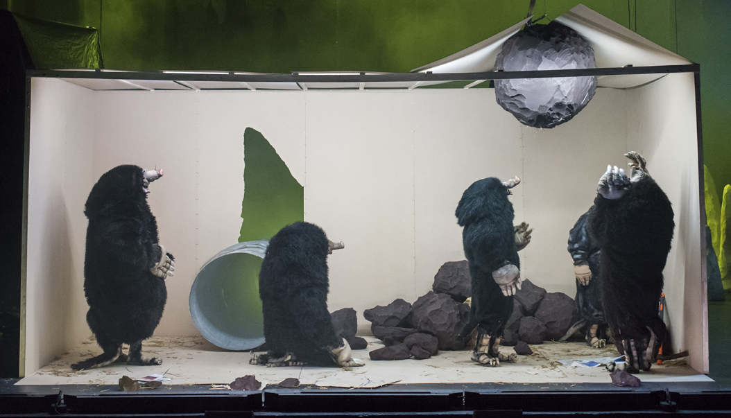 Los espectadores pueden ver a estas criaturas subterráneas viviendo, comiendo, durmiendo, muriendo, trabajando, dando a luz, copulando, divirtiéndose y formando una banda de rock… En este espectáculo contundente y explosivo, su creador evita contar historias y se concentra en la esencia de su trabajo: explorar los materiales y el poder de la música, la construcción de espacios y la creación de la luz que baña a sus personajes.