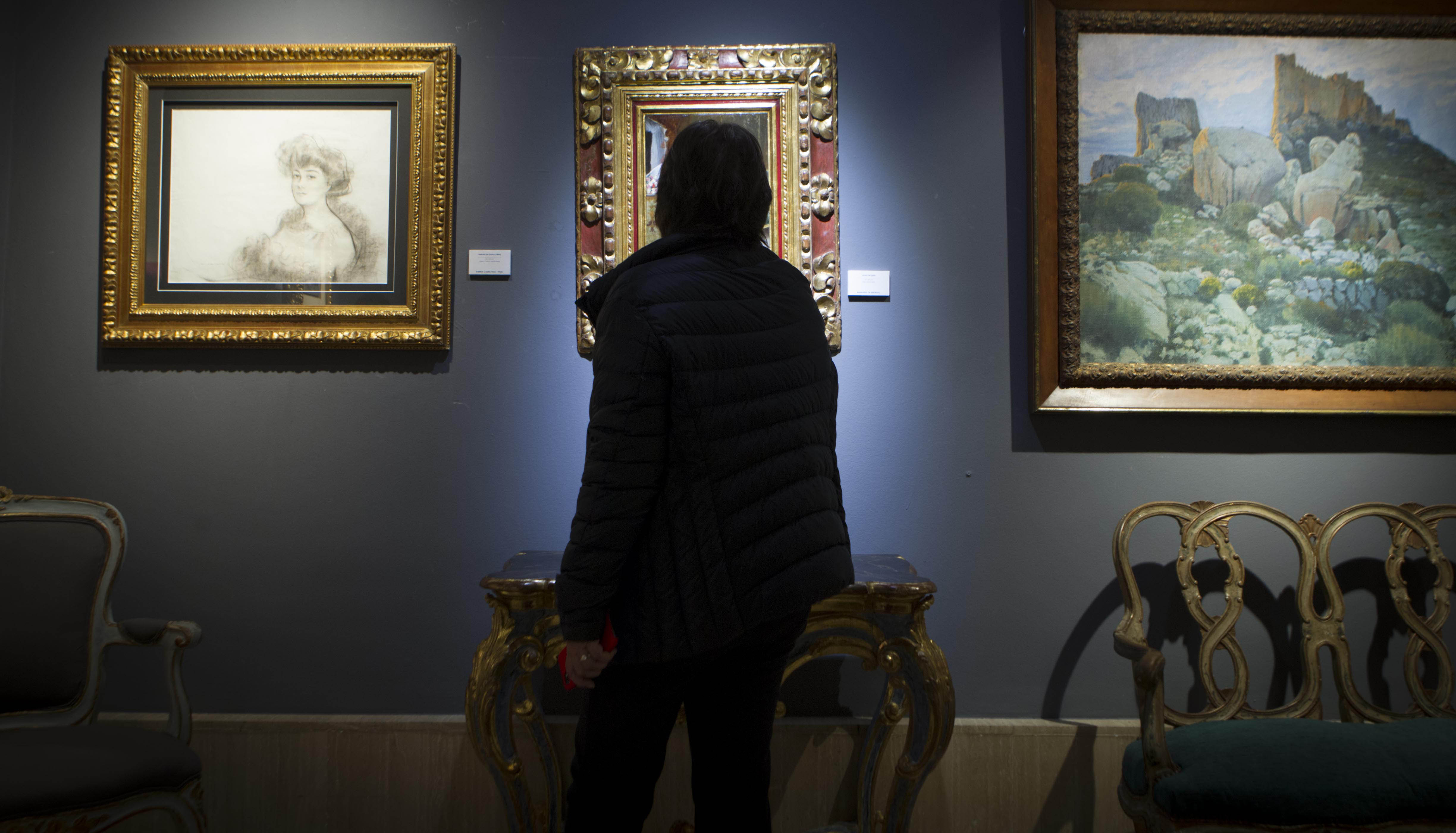 Entre los lienzos aparece un retrato de una joven de Raimundo de Madrazo; una vista del Castillo del Rey de Mallorca de Santiago Rusiñol y un retrato de mujer realizado por Antonio Carnicero, cuya tela va acompañada por un marco de la misma época.
