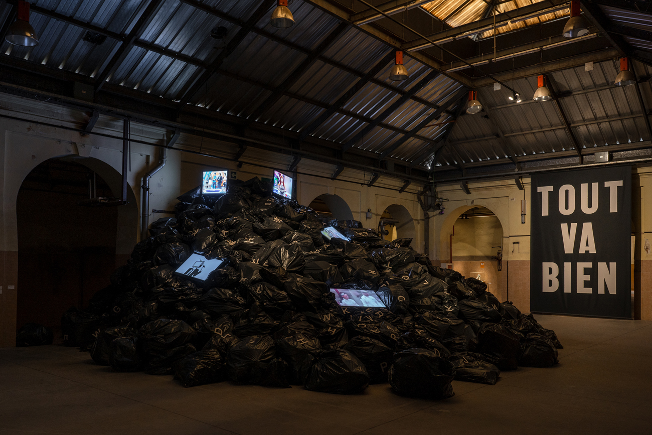 Para la ocasión se ha producido una nueva versión de la obra de 1991 Monumento a la Televisión, titulada Monumento a la Televisión después de la catástrofe, tercera obra de esta serie. La serigrafía Tout va bien, en la que se inspira el título de la exposición, es una apropiación de una página de Le Monde donde se anunciaba la película de 1972 de Jean-Luc Godard.