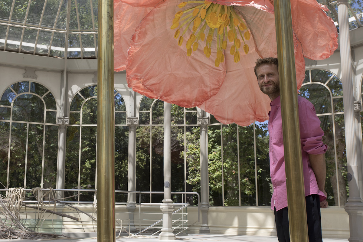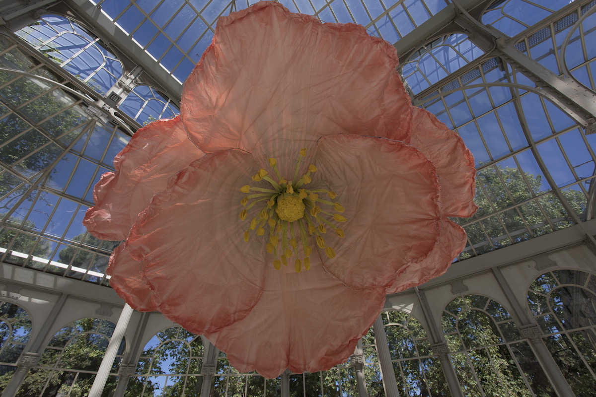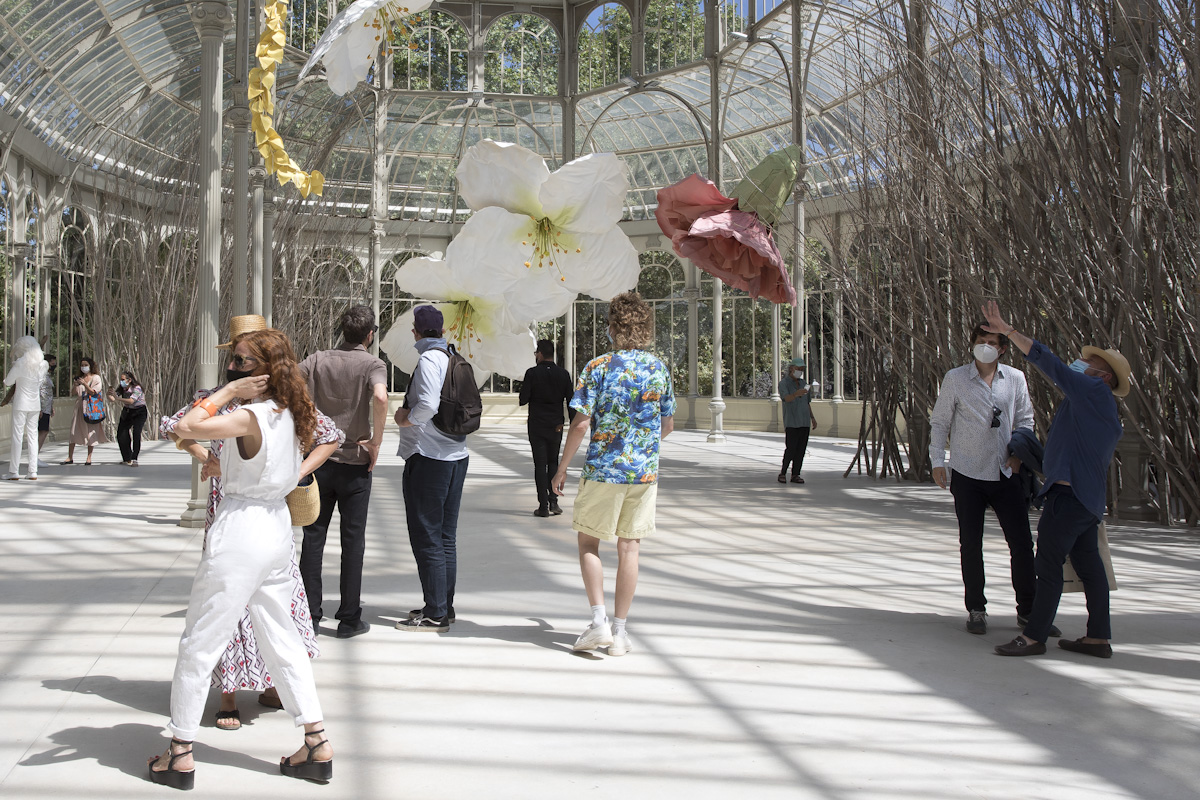 El otro componente fundamental de la exposición son las grandes flores que decoran el Palacio. Están realizadas en un marco de acero y lienzo pintado, y son fruto del trabajo colaborativo con su compañero Álvaro Urbano, también artista. Su elección forma parte de la historia personal que les une y tiene el propósito de celebrar su relación: forsythias, semillas de palma, flores de cerezo, amapola, clavel y lirio. Todas ellas son flores que tiene un significado especial para el artista, ya que han formado parte de su vida en momentos puntuales de su relación con sus familiares y con los de Álvaro.“He querido tratar el Palacio de Cristal como un lugar de celebración del amor, y en origen, este proyecto incluía una performance simbólica simulando una unión matrimonial entre Álvaro y yo”.