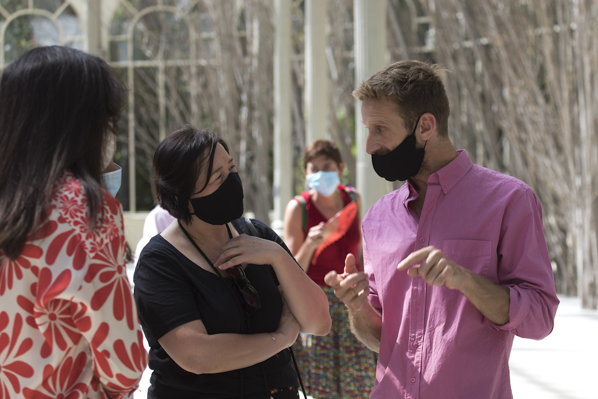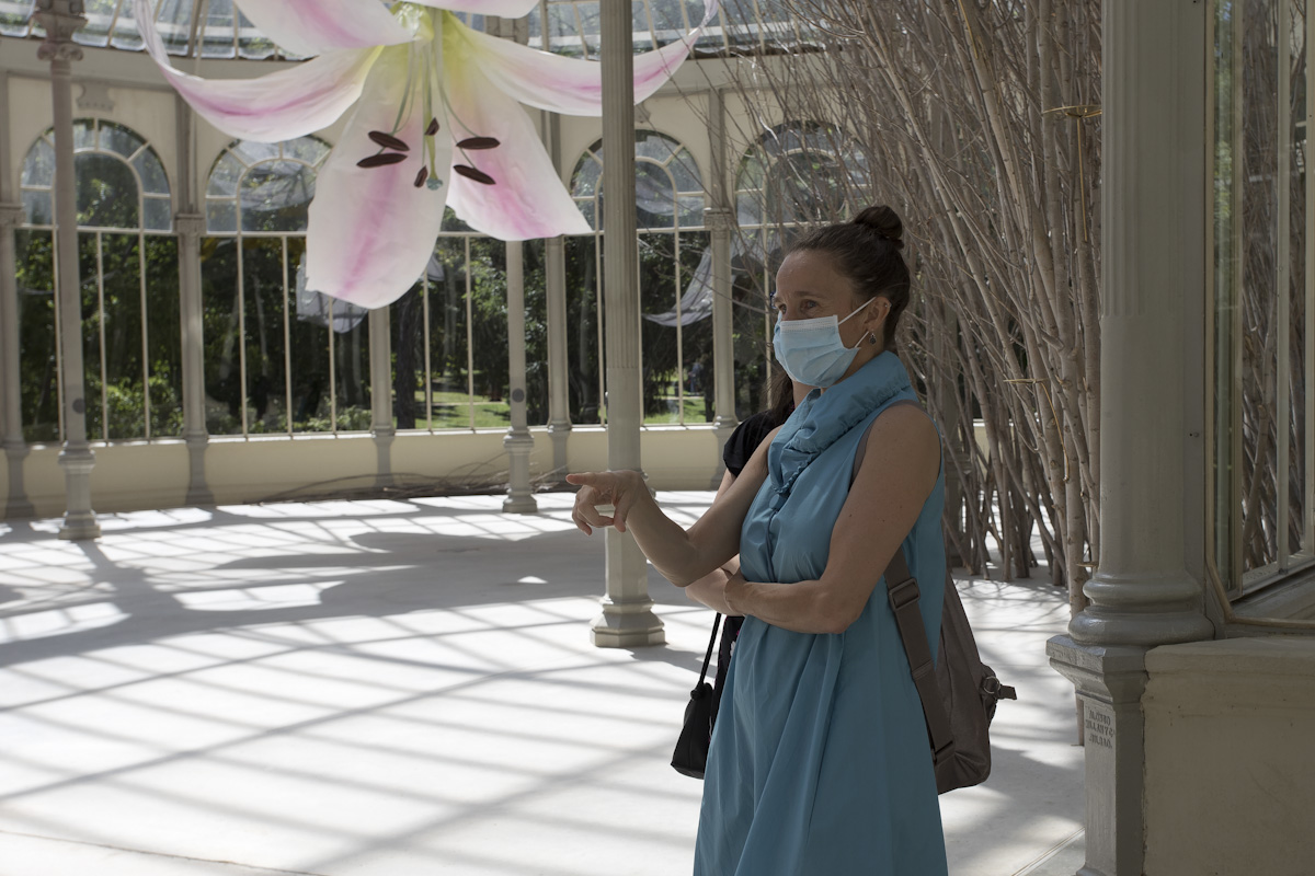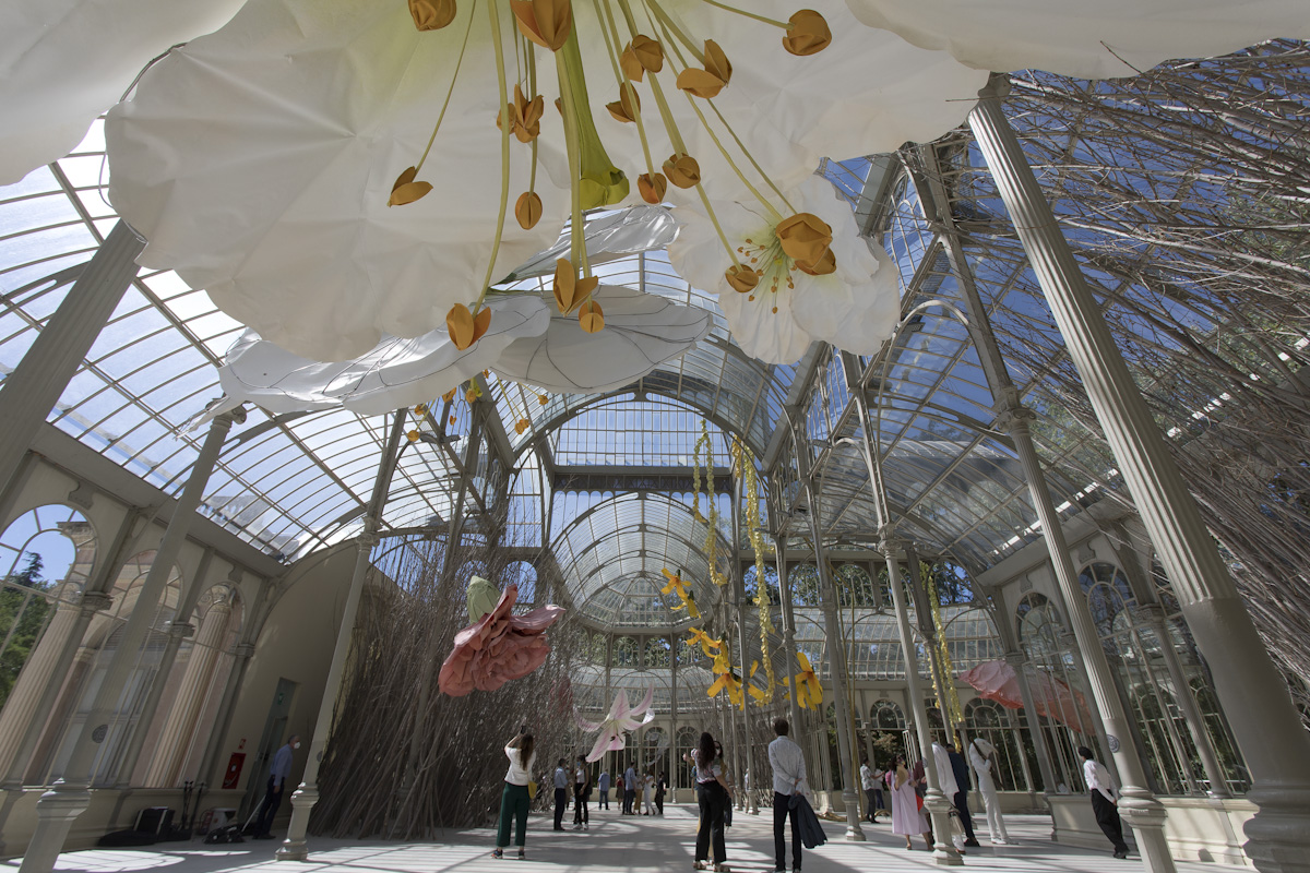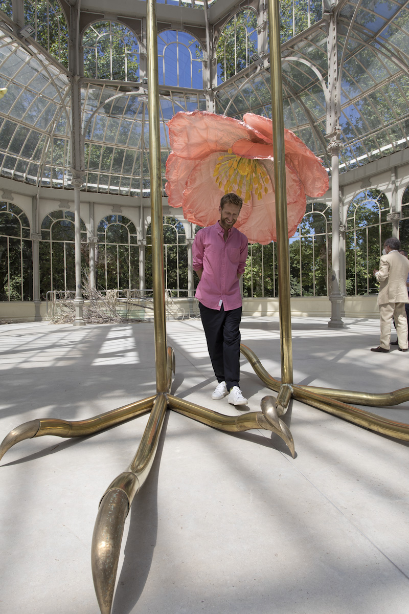 El otro componente fundamental de la exposición son las grandes flores que decoran el Palacio. Están realizadas en un marco de acero y lienzo pintado, y son fruto del trabajo colaborativo con su compañero Álvaro Urbano, también artista. Su elección forma parte de la historia personal que les une y tiene el propósito de celebrar su relación: forsythias, semillas de palma, flores de cerezo, amapola, clavel y lirio. Todas ellas son flores que tiene un significado especial para el artista, ya que han formado parte de su vida en momentos puntuales de su relación con sus familiares y con los de Álvaro.“He querido tratar el Palacio de Cristal como un lugar de celebración del amor, y en origen, este proyecto incluía una performance simbólica simulando una unión matrimonial entre Álvaro y yo”.