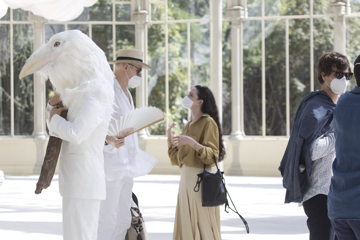 Para crear ese ambiente de tránsito se han abierto varias ventanas del Palacio e instalado estructuras y comederos que atraigan a las aves y demás insectos que habitan el Retiro. Los pájaros son un elemento muy recurrente en su trabajo, y para él representan la metáfora de la libertad sobre lo que no pueden hacer los humanos: volar y vivir sin fronteras.