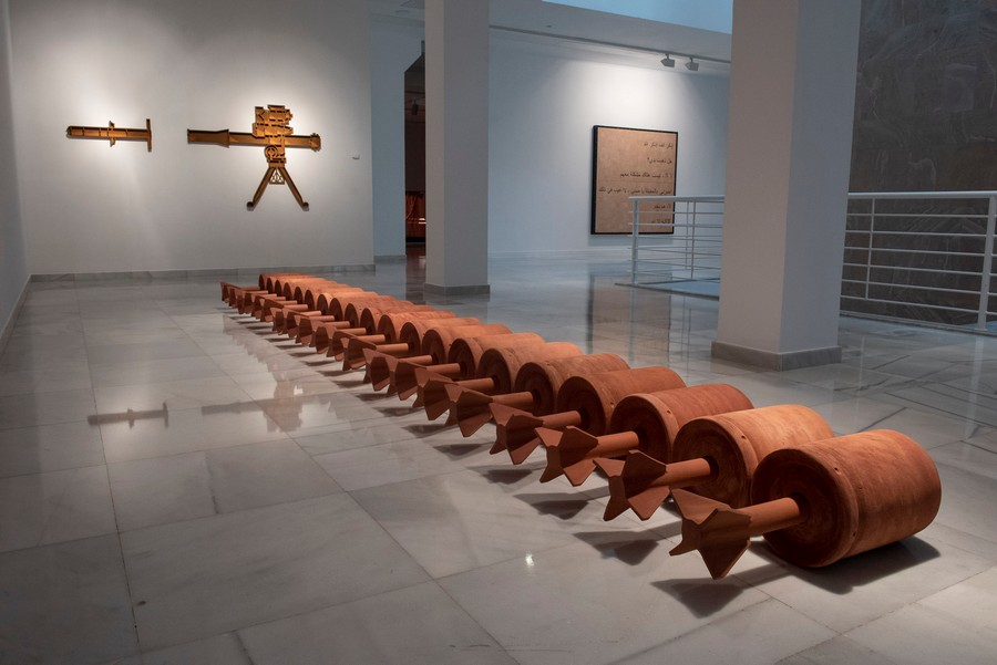 La mayor parte de las obras presentes en la exposición indagan en la forma en que la guerra se infiltra en el espacio privado, se nutre de materiales elementales y metodologías de enfrentamiento ancestrales, en las antípodas de la alta tecnología militar de Occidente.