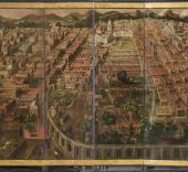 Este biombo de dos haces representa, por un lado, la conquista de Tenochtitlán, y por el otro, la ciudad de México, y probablemente fue un regalo del ayuntamiento de la ciudad a un virrey al asumir su gobierno. Como tal evoca nociones centrales en la cultura y la memoria de las élites de la capital.