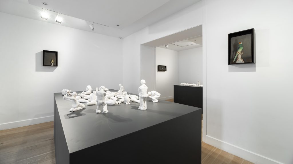 A través de más de cien piezas de porcelana blanca, un material que Guilisasti lleva años investigando, El mar se viste de pluma y el hielo se pinta de rojo trae a la galería tres escenas del pasado; tres momentos del relato de la travesía de Davis y su tripulación en la Patagonia a finales del siglo XVI, cada uno de los cuales acompañado de una instalación sonora que sitúa en el contexto del territorio donde tuvo lugar.