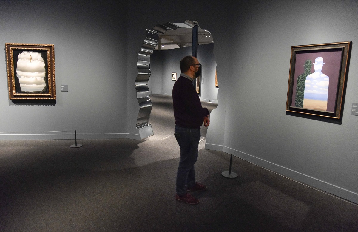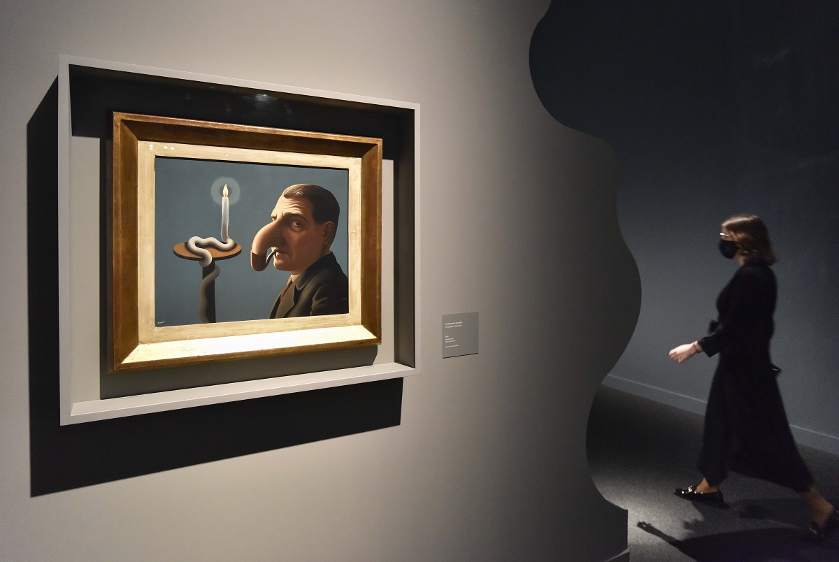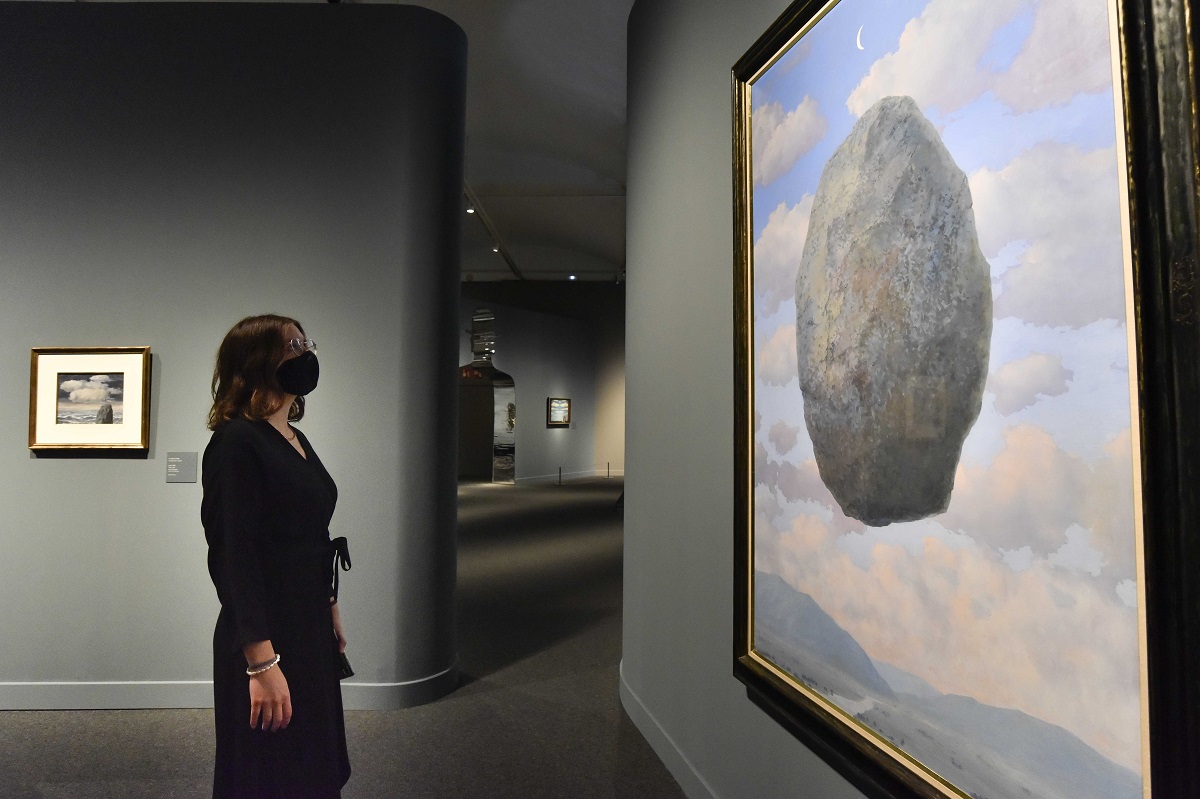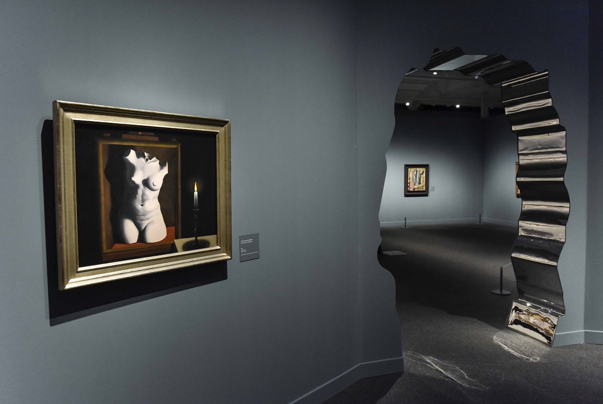 Comisariada por Guillermo Solana, director artístico del Thyssen, esta exposición reúne 69 pinturas procedentes de instituciones, galerías y colecciones particulares de más de 55 prestadores. Entre estas obras destacan La cascada (1961), La alta sociedad (1965-1966), La lámpara filosófica (1936), Tentativa de lo imposible (1928), Delirios de grandeza (1948), El sueño (1945), La violación (1945), La sala de escucha (1958), La llave de los campos (1936), El gran siglo (1954) o El sentido de las realidades (1963), que viaja desde el Museo de Arte de la Prefectura de Miyazaki de Japón y solo podrá verse en Barcelona. La muestra se completa con una selección de fotografías y películas caseras realizadas por el propio artista.