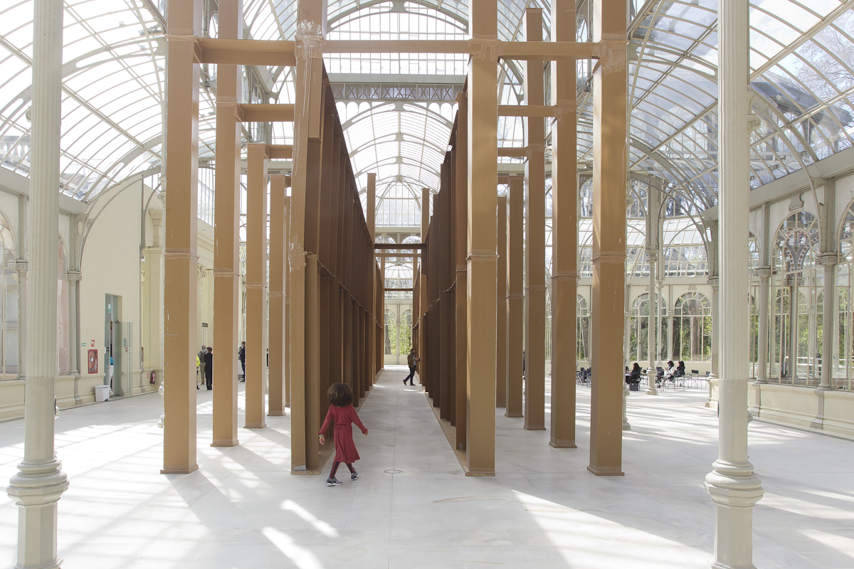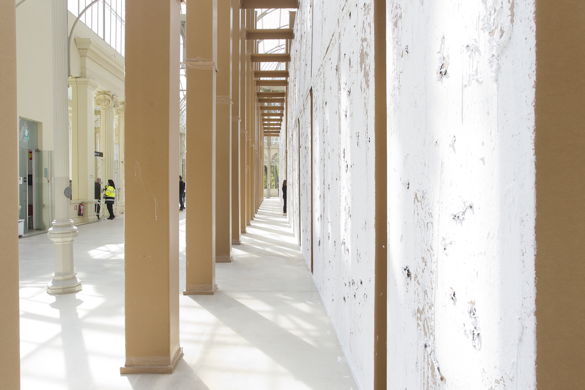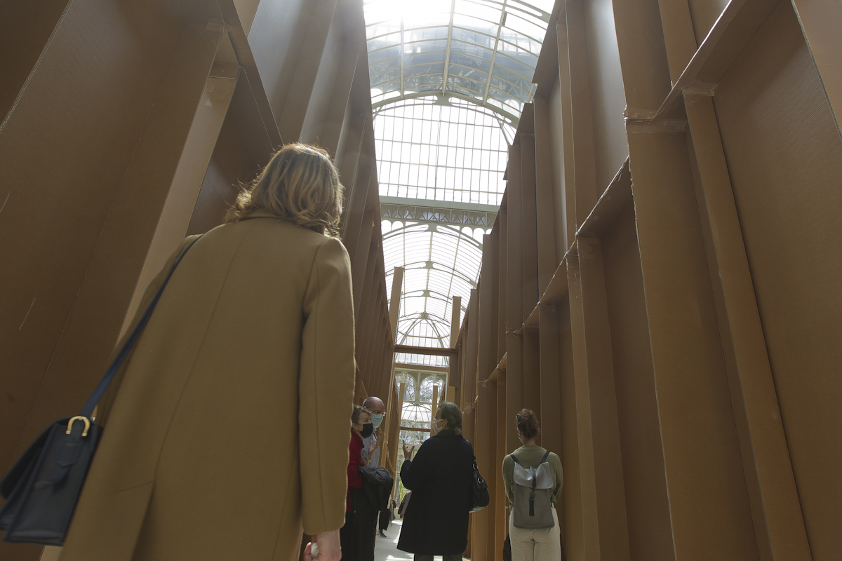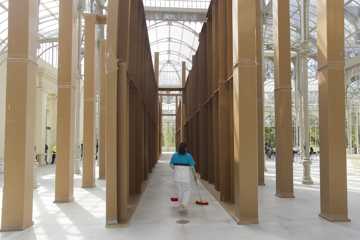 La naturaleza efímera de las construcciones del artista –que con frecuencia se antojan maquetas fuera de escala– va inevitablemente unida a dos conceptos: tiempo y lugar. Bunga redimensiona la experiencia de un espectador que no solo contempla la obra, sino que también se integra en ella y la transforma. La estructura de cartón que conforma la instalación que se presenta se confunde con el propio edificio de hierro y cristal que lo acoge, dando lugar a un entorno híbrido y cambiante: “Un espacio performativo, espontáneo e inestable que será construido, usado y destruido con mucha más facilidad que la arquitectura convencional”, afirma la coordinadora de la muestra, Soledad Liaño. El artista dirige la atención del espectador precisamente a todas estas arquitecturas nómadas, de materiales precarios.