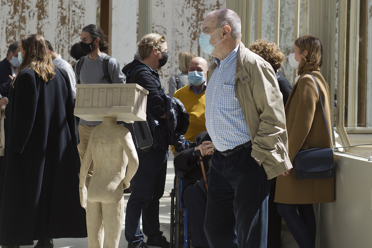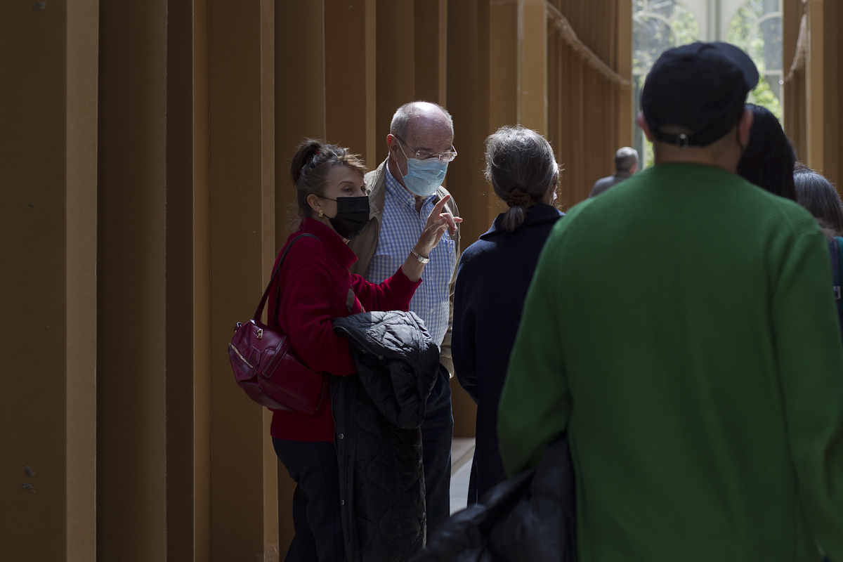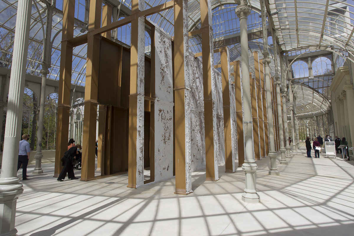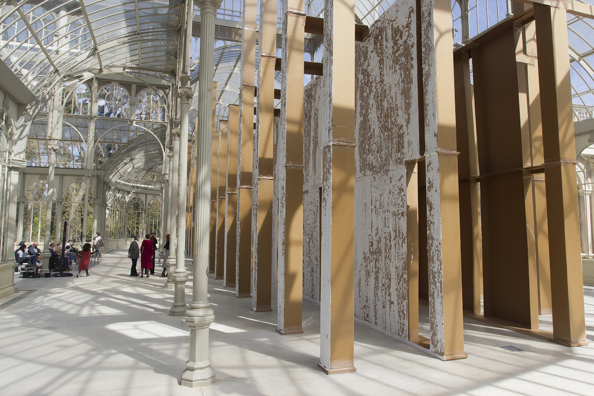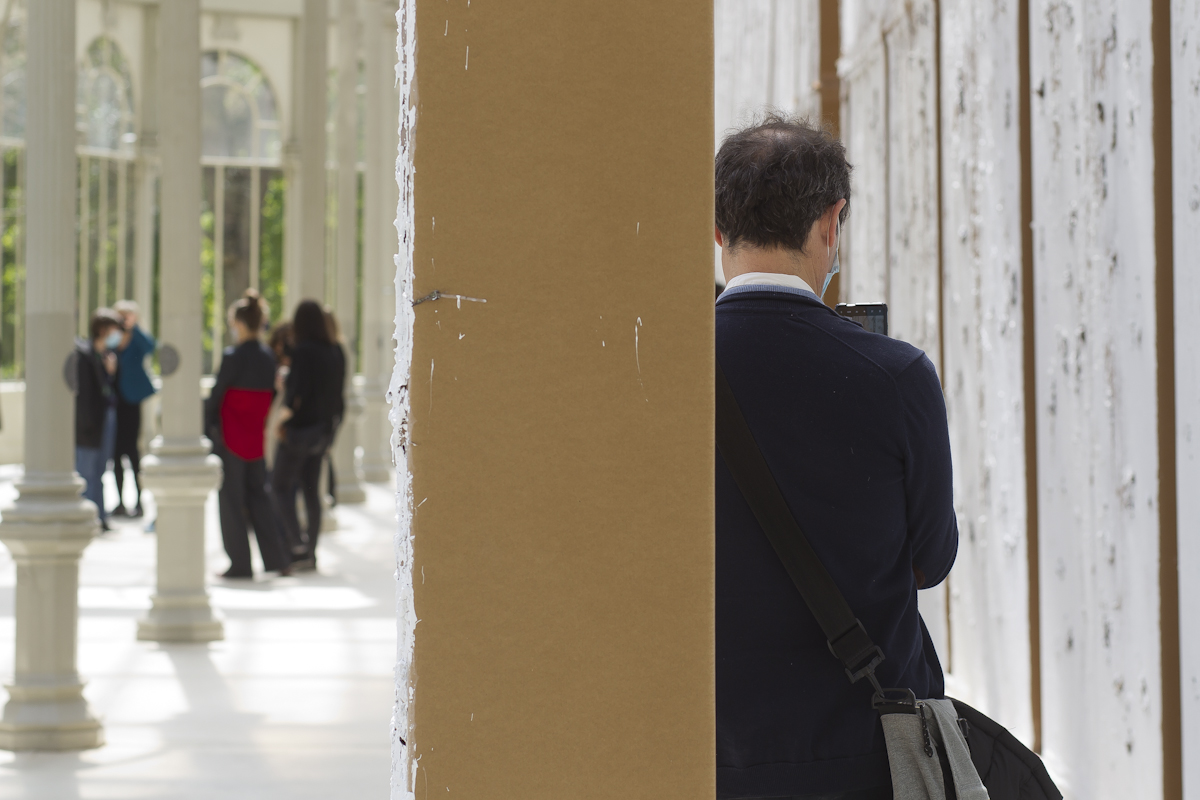 La naturaleza efímera de las construcciones del artista –que con frecuencia se antojan maquetas fuera de escala– va inevitablemente unida a dos conceptos: tiempo y lugar. Bunga redimensiona la experiencia de un espectador que no solo contempla la obra, sino que también se integra en ella y la transforma. La estructura de cartón que conforma la instalación que se presenta se confunde con el propio edificio de hierro y cristal que lo acoge, dando lugar a un entorno híbrido y cambiante: “Un espacio performativo, espontáneo e inestable que será construido, usado y destruido con mucha más facilidad que la arquitectura convencional”, afirma la coordinadora de la muestra, Soledad Liaño. El artista dirige la atención del espectador precisamente a todas estas arquitecturas nómadas, de materiales precarios.
