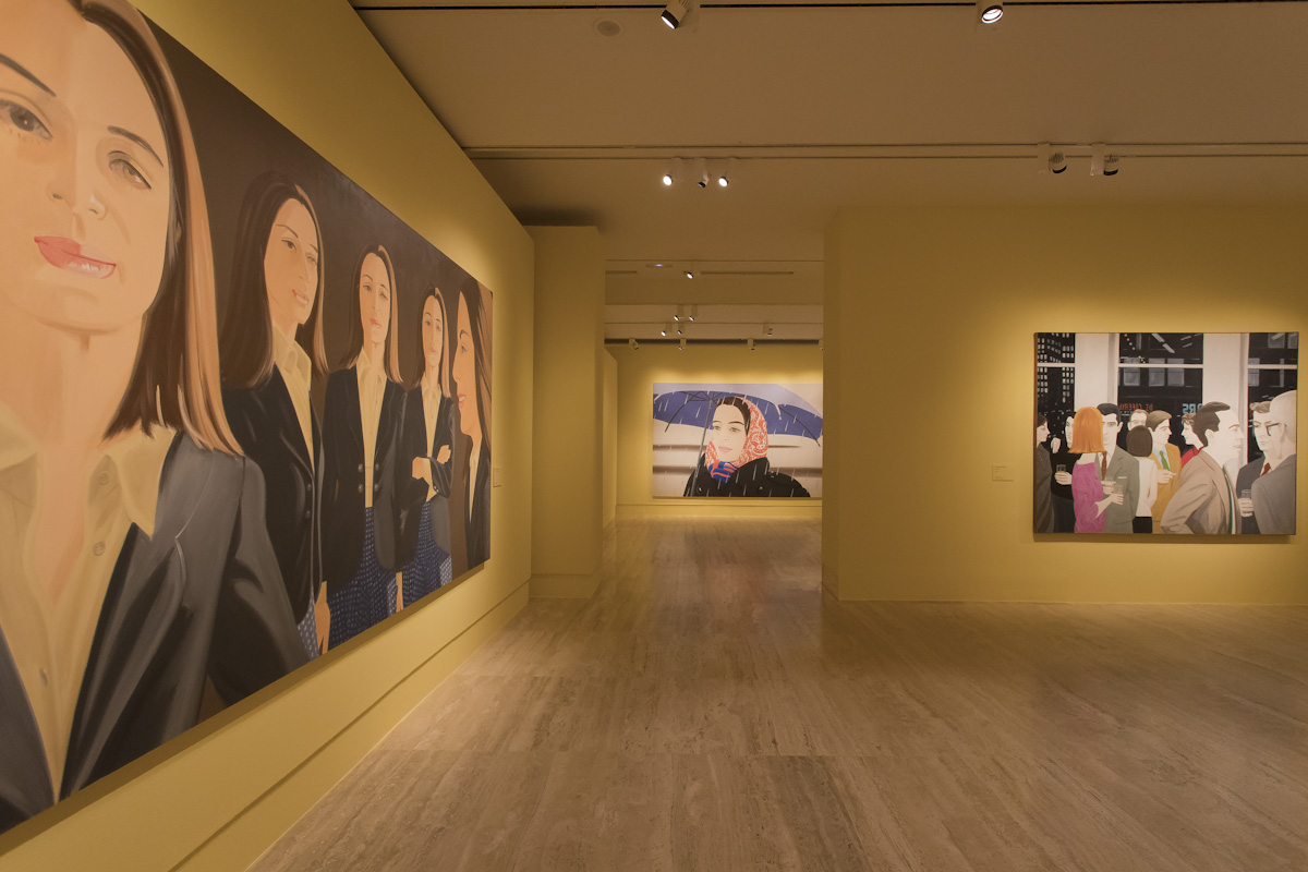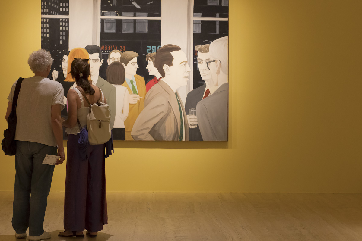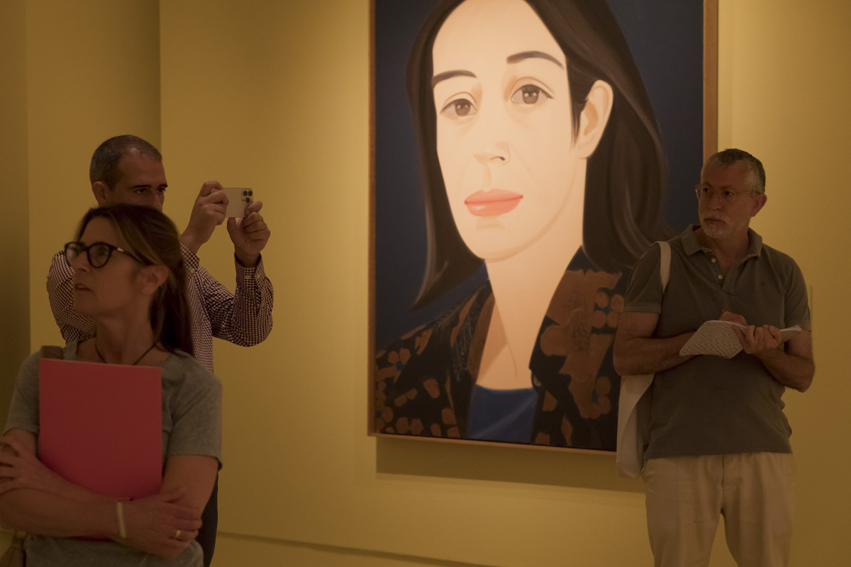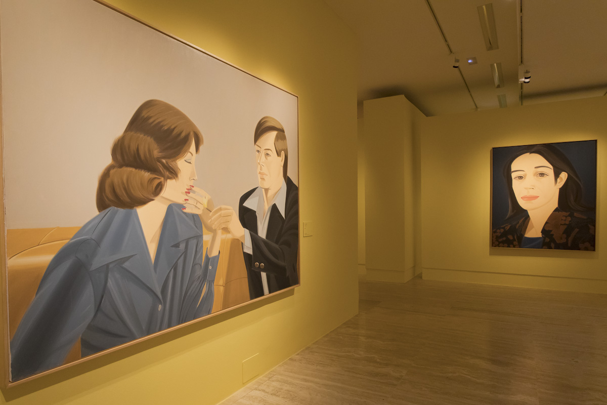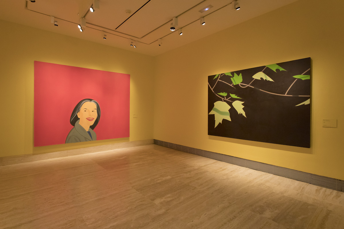 La muestra presenta las obras cronológicamente y cubre casi sesenta años de su trabajo, desde 1959 hasta 2018, revelando la renovación constante a la que se ha sometido a lo largo de su carrera, en la que ha recurrido siempre a los mismos temas, pero sin dejar de introducir nuevas perspectivas. Así, incluye piezas fundamentales de varias décadas, como The Red Smile (1963), procedente del Whitney Museum of American Art (Nueva York); Round Hill (1977), de Los Angeles County Museum of Art; Red Coat (1982), del Metropolitan Museum of Art (Nueva York); Black Hat #2 (2010), de la Albertina (Viena), así como The Cocktail Party (1965), Ted Berrigan (1967) Blue Umbrella #2 (1972) y Green Table (1996), pertenecientes a colecciones privadas. Entre los prestadores figuran, además, otros museos como el MoMA o el Reina Sofía.