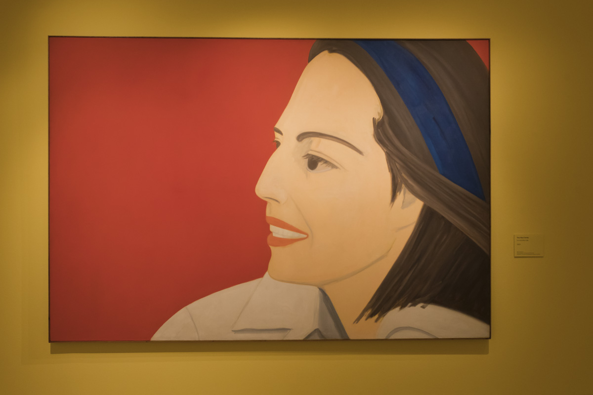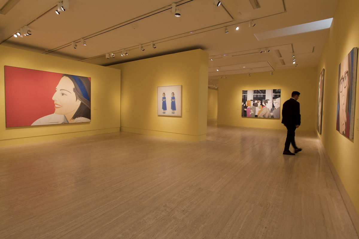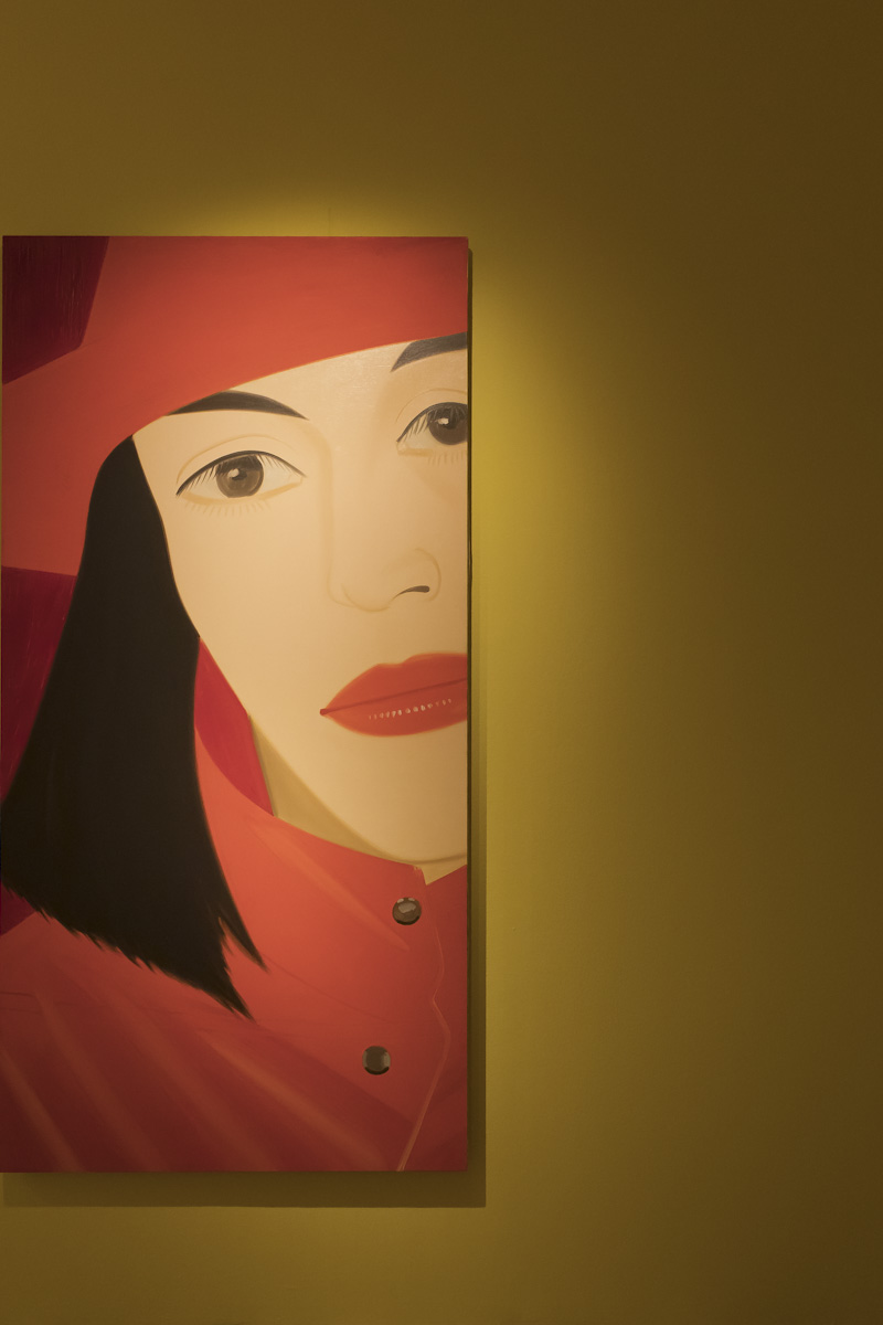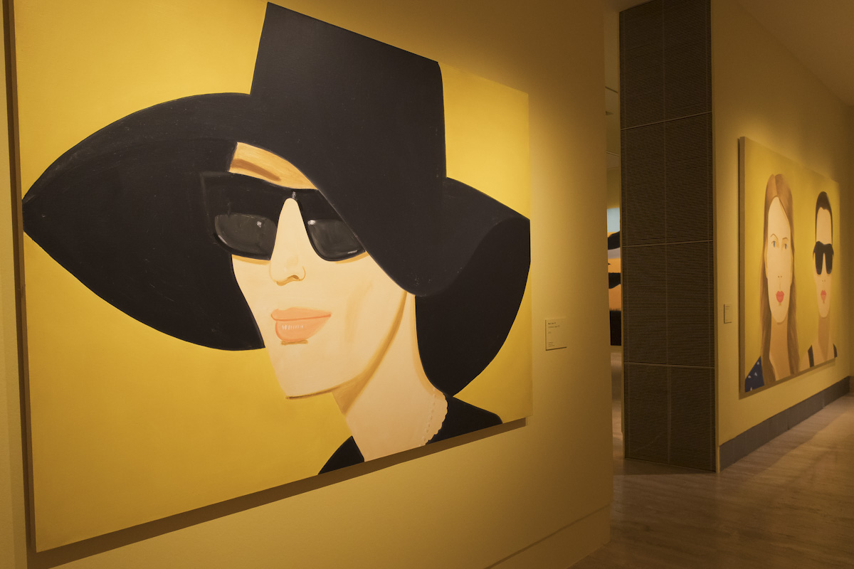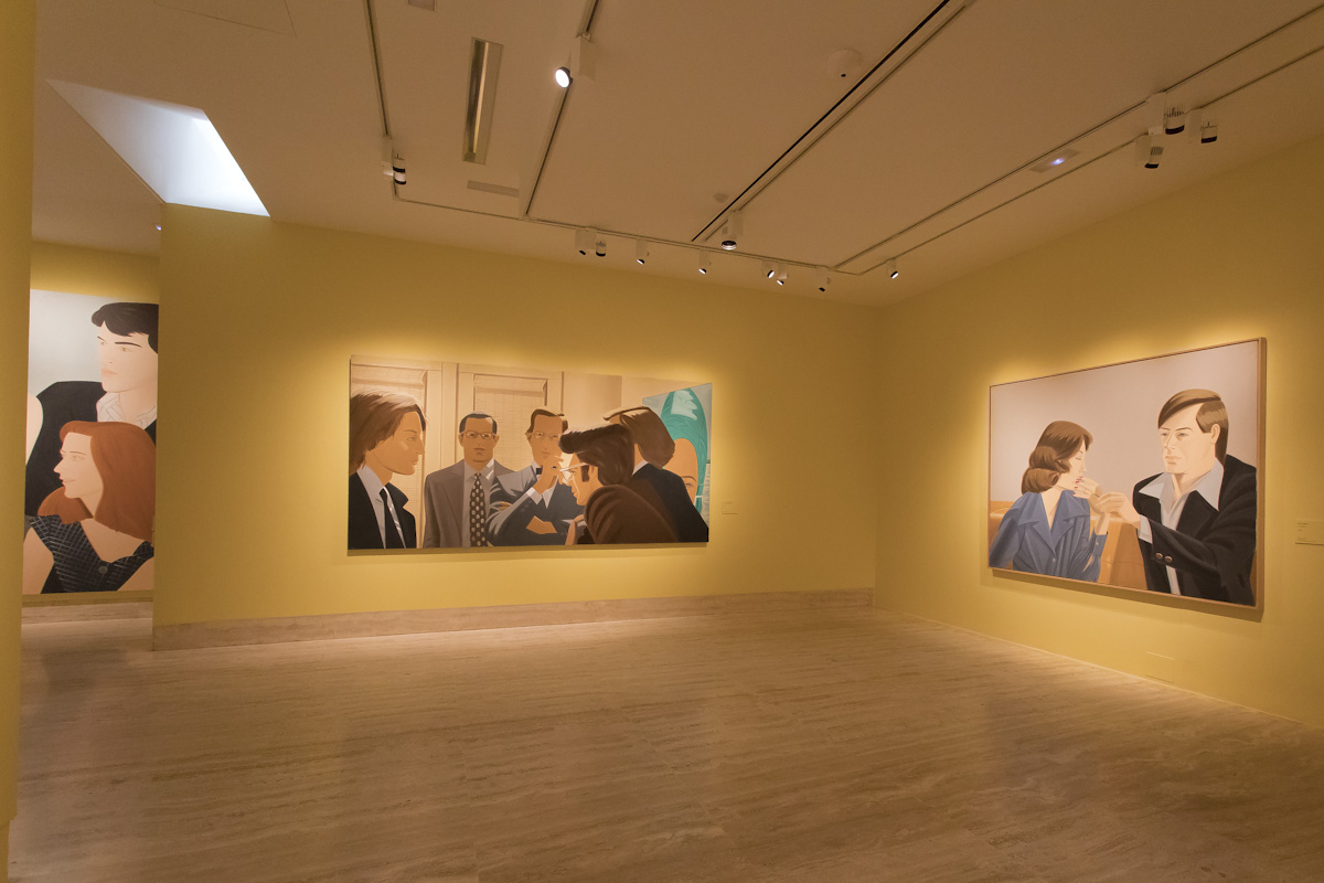 La muestra presenta las obras cronológicamente y cubre casi sesenta años de su trabajo, desde 1959 hasta 2018, revelando la renovación constante a la que se ha sometido a lo largo de su carrera, en la que ha recurrido siempre a los mismos temas, pero sin dejar de introducir nuevas perspectivas. Así, incluye piezas fundamentales de varias décadas, como The Red Smile (1963), procedente del Whitney Museum of American Art (Nueva York); Round Hill (1977), de Los Angeles County Museum of Art; Red Coat (1982), del Metropolitan Museum of Art (Nueva York); Black Hat #2 (2010), de la Albertina (Viena), así como The Cocktail Party (1965), Ted Berrigan (1967) Blue Umbrella #2 (1972) y Green Table (1996), pertenecientes a colecciones privadas. Entre los prestadores figuran, además, otros museos como el MoMA o el Reina Sofía.
