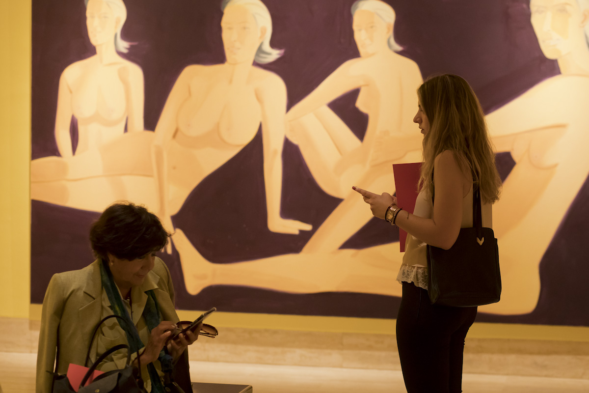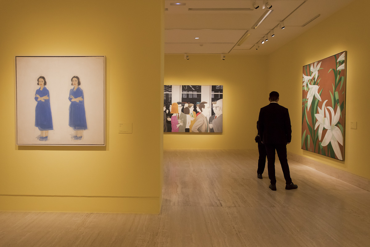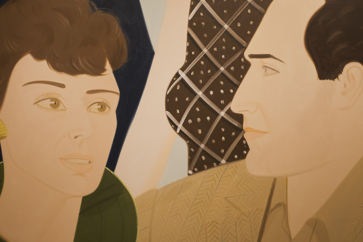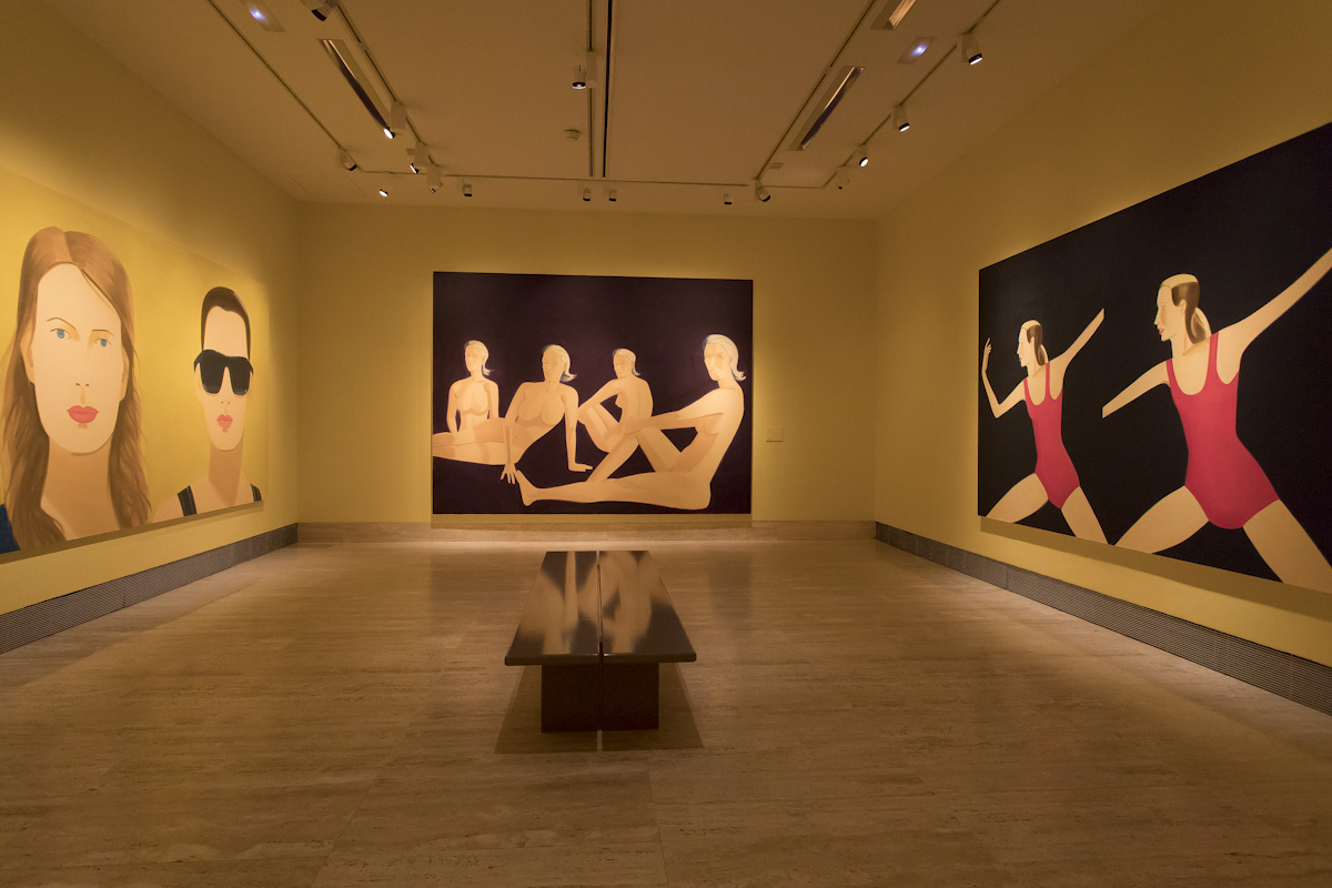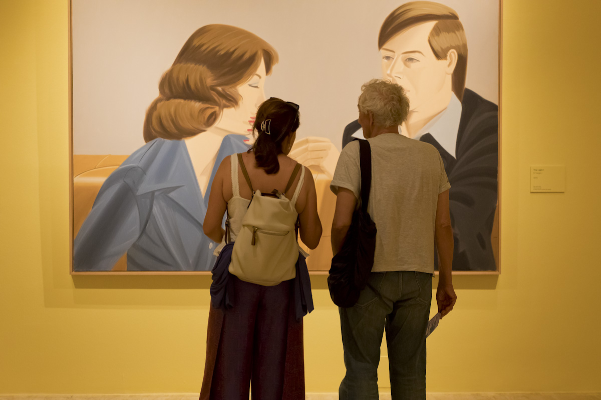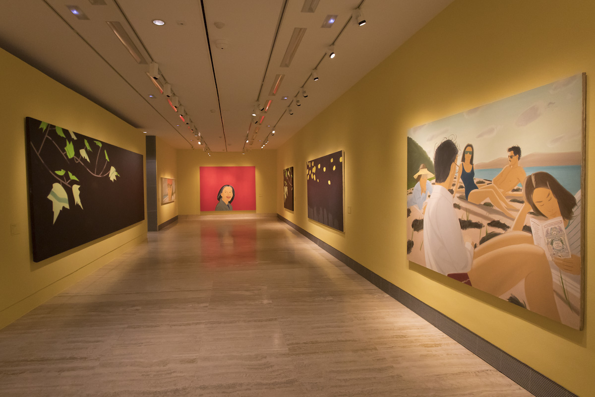 La muestra presenta las obras cronológicamente y cubre casi sesenta años de su trabajo, desde 1959 hasta 2018, revelando la renovación constante a la que se ha sometido a lo largo de su carrera, en la que ha recurrido siempre a los mismos temas, pero sin dejar de introducir nuevas perspectivas. Así, incluye piezas fundamentales de varias décadas, como The Red Smile (1963), procedente del Whitney Museum of American Art (Nueva York); Round Hill (1977), de Los Angeles County Museum of Art; Red Coat (1982), del Metropolitan Museum of Art (Nueva York); Black Hat #2 (2010), de la Albertina (Viena), así como The Cocktail Party (1965), Ted Berrigan (1967) Blue Umbrella #2 (1972) y Green Table (1996), pertenecientes a colecciones privadas. Entre los prestadores figuran, además, otros museos como el MoMA o el Reina Sofía.