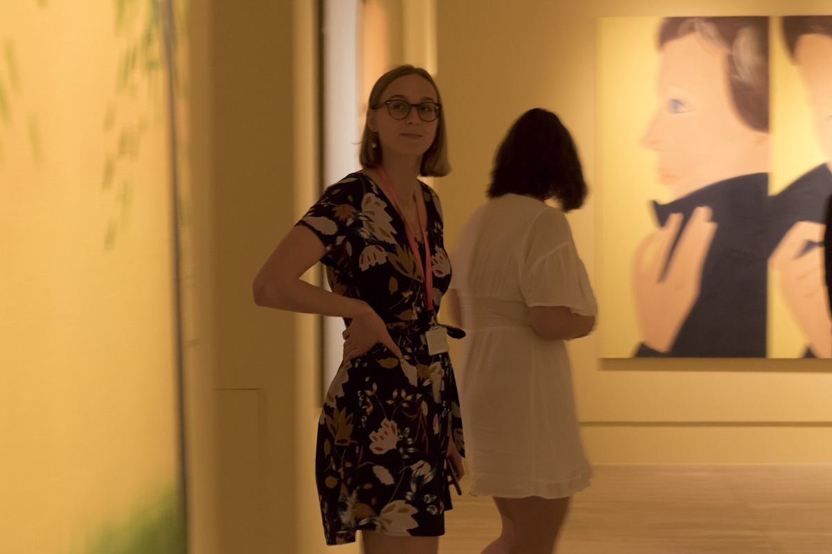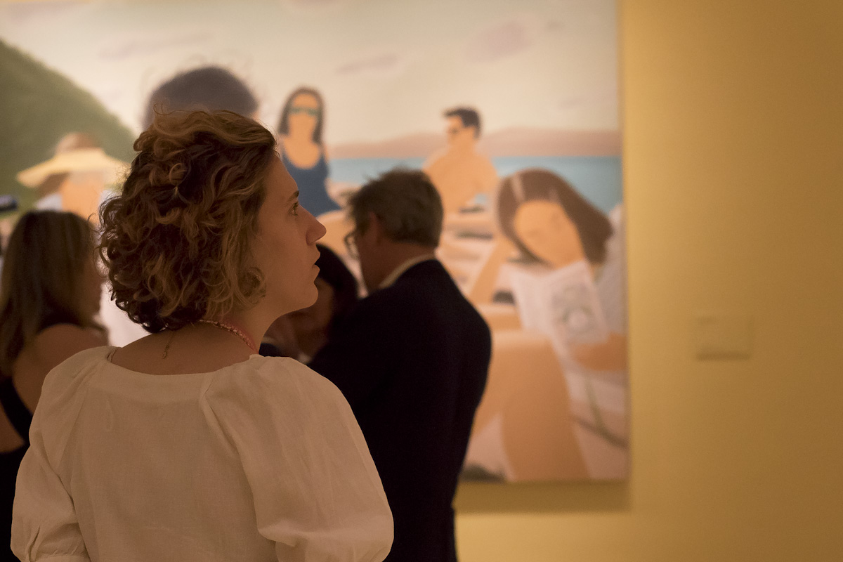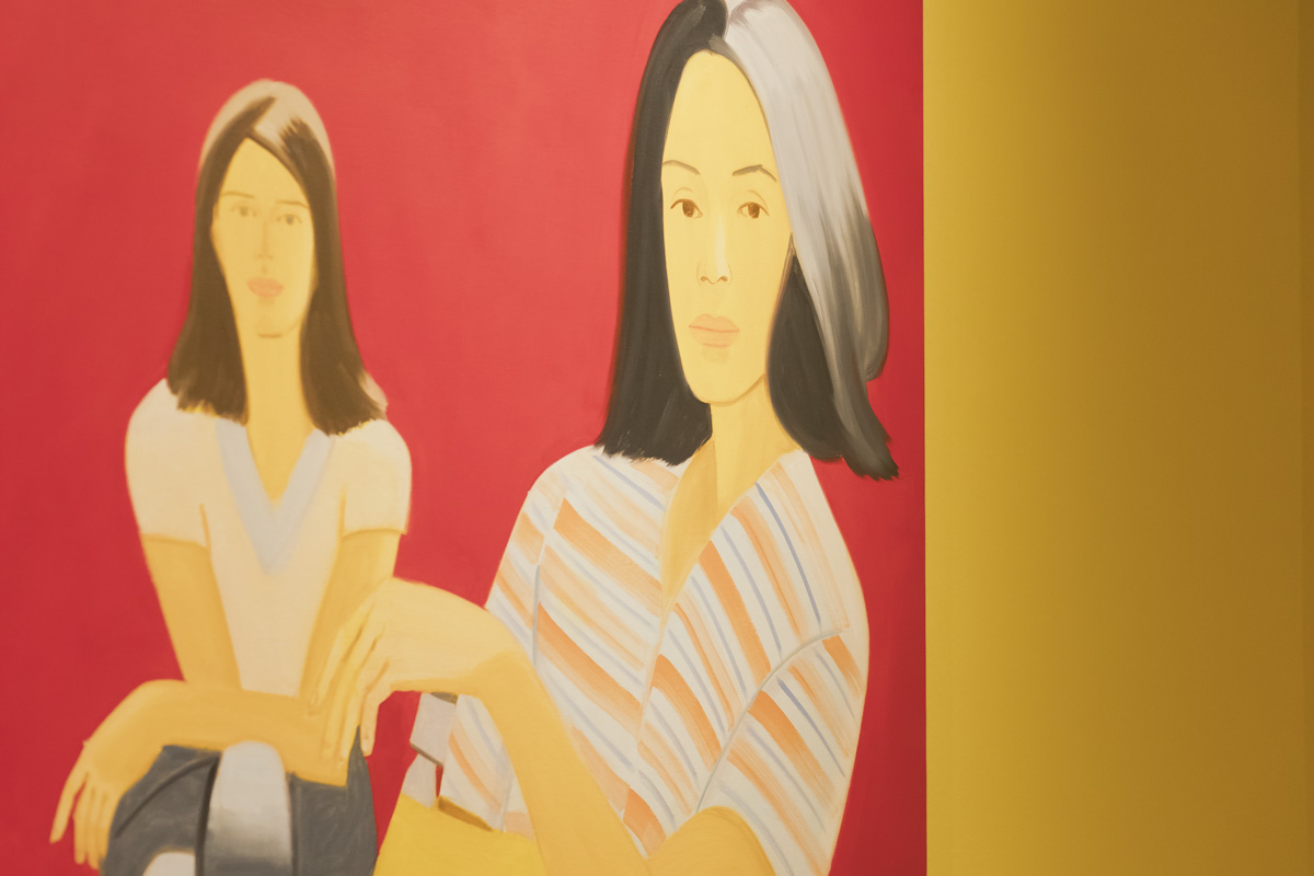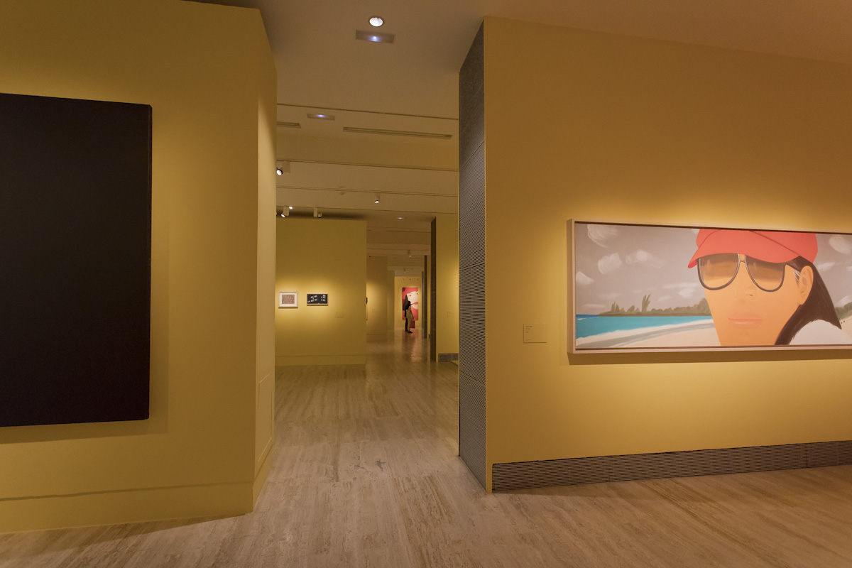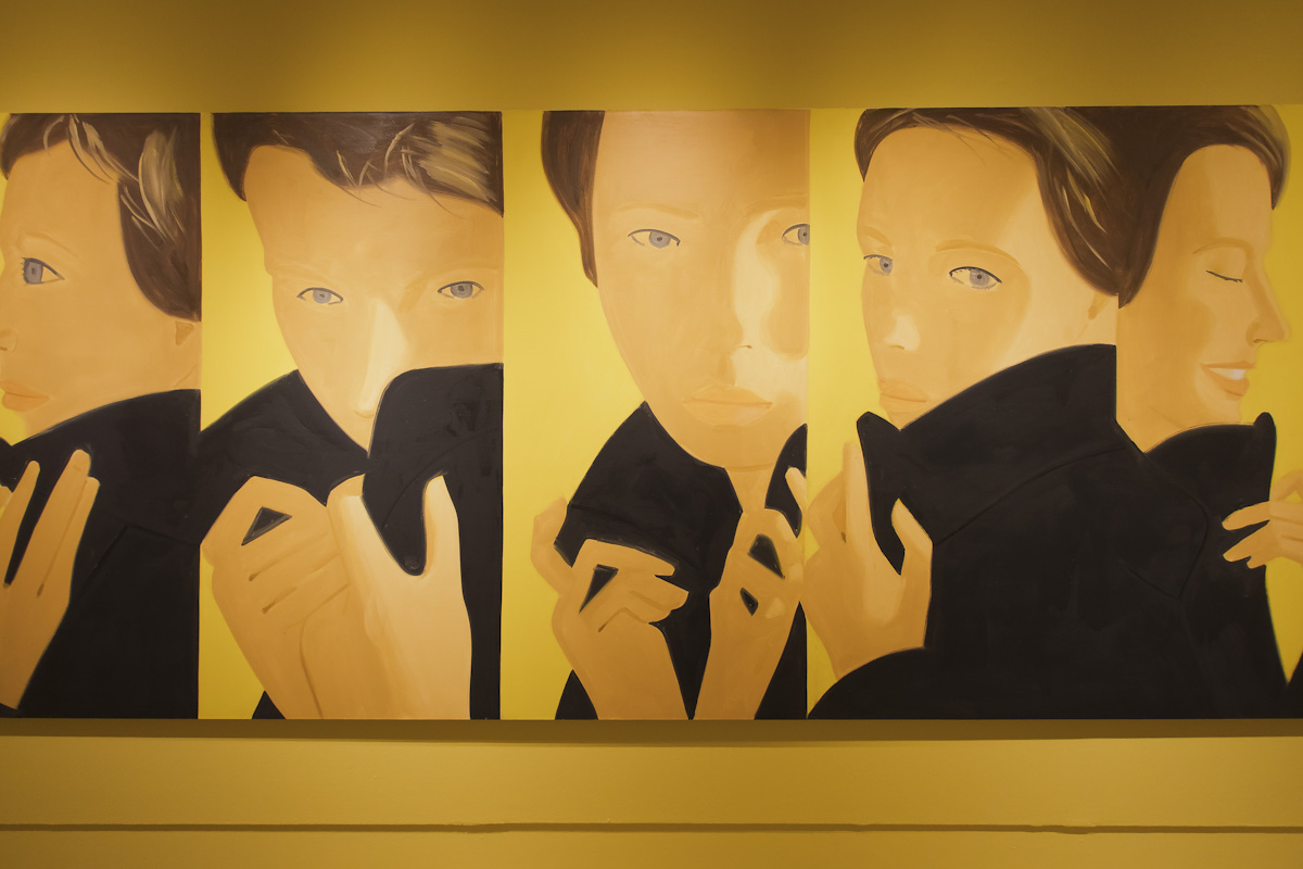 La muestra presenta las obras cronológicamente y cubre casi sesenta años de su trabajo, desde 1959 hasta 2018, revelando la renovación constante a la que se ha sometido a lo largo de su carrera, en la que ha recurrido siempre a los mismos temas, pero sin dejar de introducir nuevas perspectivas. Así, incluye piezas fundamentales de varias décadas, como The Red Smile (1963), procedente del Whitney Museum of American Art (Nueva York); Round Hill (1977), de Los Angeles County Museum of Art; Red Coat (1982), del Metropolitan Museum of Art (Nueva York); Black Hat #2 (2010), de la Albertina (Viena), así como The Cocktail Party (1965), Ted Berrigan (1967) Blue Umbrella #2 (1972) y Green Table (1996), pertenecientes a colecciones privadas. Entre los prestadores figuran, además, otros museos como el MoMA o el Reina Sofía.