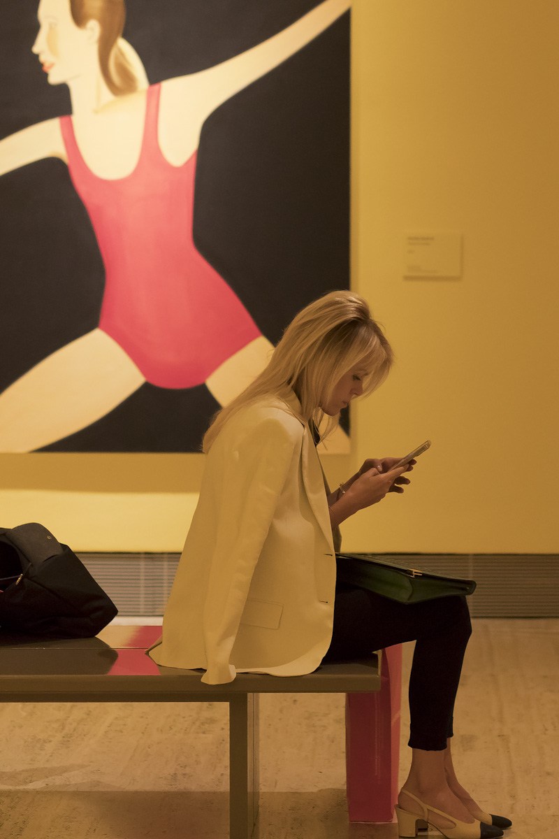 En 1977 le encargaron un gran mural en Times Square, donde podría competir directamente con las vallas publicitarias. Titulado Nine Women, estaba compuesto por 23 primeros planos de mujeres, de seis metros de altura, dispuestos en un panel de 75 metros de largo y coronado por una torre de 18 metros de alto en la intersección de Times Square con la calle 42 y la Séptima Avenida. “Descubrí que mi pintura era más potente que cualquiera de las vallas publicitarias que la rodeaban”, afirma Katz. “Fue una de las grandes experiencias de mi vida”.
