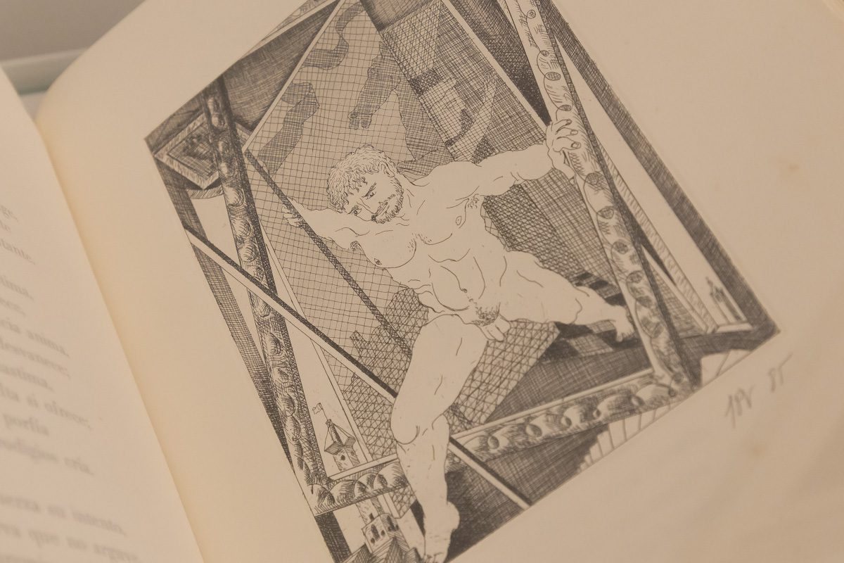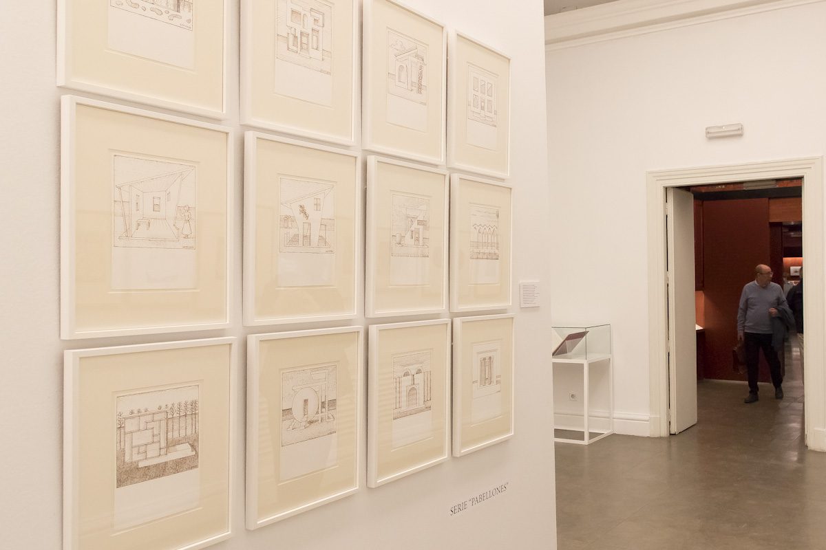 Los dos primeros trabajos mencionados forman parte de las cuatro series en las que se estructura la muestra. Otro conjunto de obras expuestas se articula en torno a Pabellones, fruto de la experimentación, una de las primeras incursiones del artista en el mundo digital, donde recrea espacios arquitectónicos formados a partir de la combinación de diagonales entrecruzadas en la estampa, creando divisiones armónicas. Finalmente se presenta la serie inédita Verbum et imago, creada exprofeso para la ocasión, formada por siete aguafuertes con frases que condensan pensamientos líricos del artista.