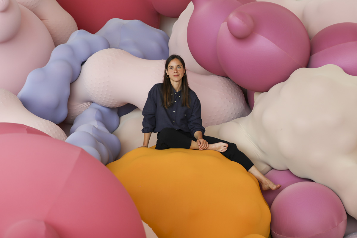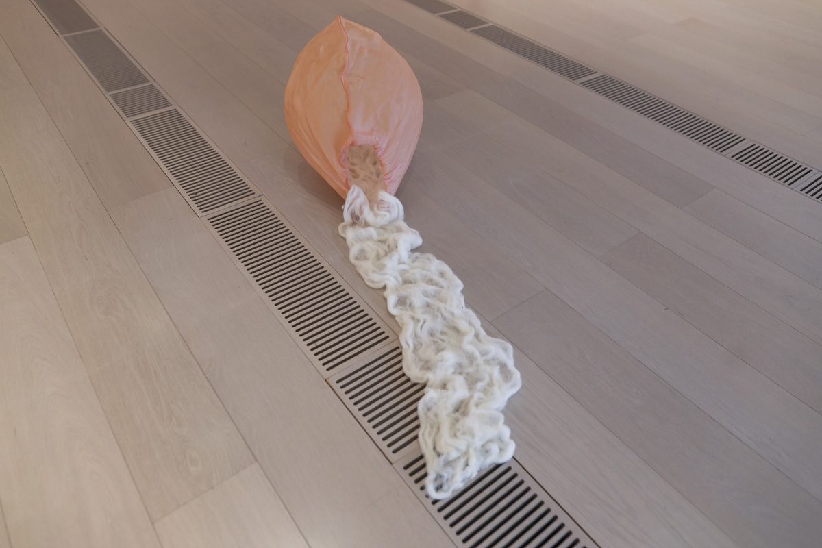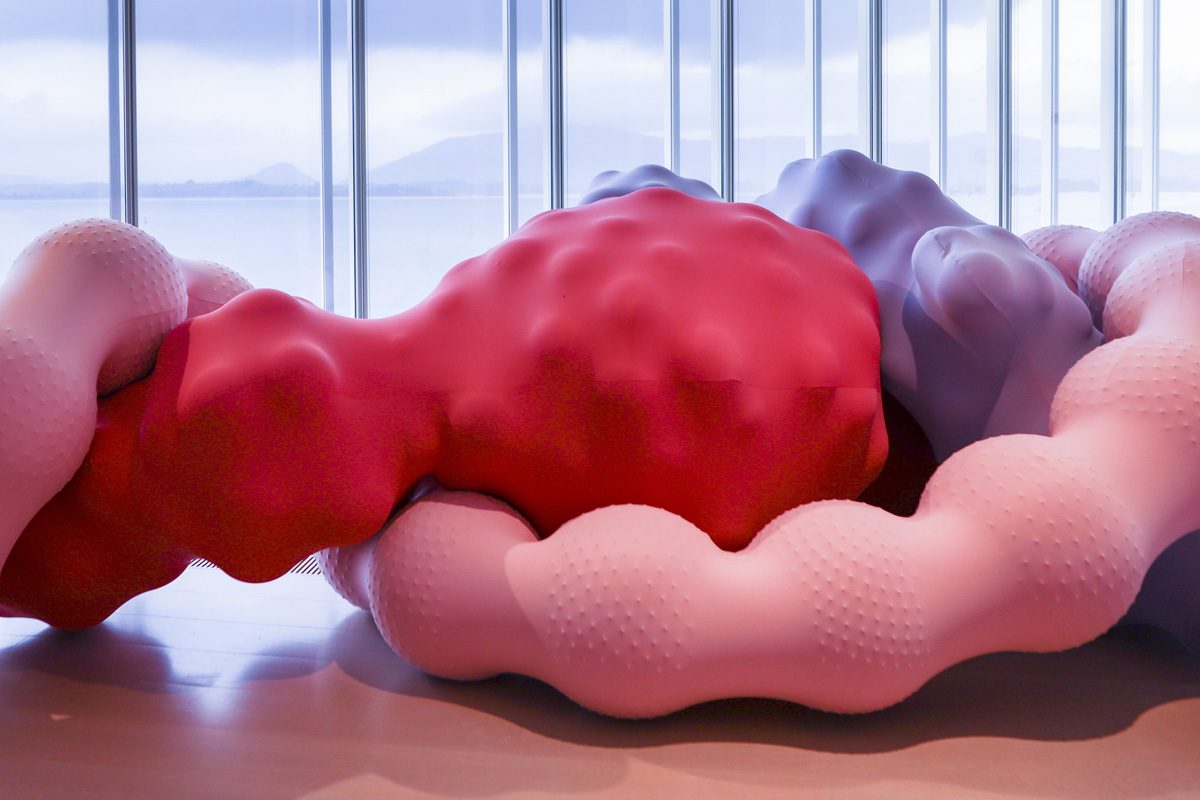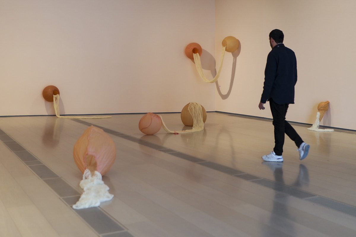 Concebida para esta exposición y producida con la colaboración del MACBA, en la muestra sorprende especialmente Oozing (rezumamiento), una acumulación de esculturas hinchables ante la que el visitante se vuelve minúsculo. Parece que esté siendo testigo de un incontrolable crecimiento orgánico, un enredo simbiótico entre obras-cuerpos, formas, materiales y colores que provienen de mundos desconocidos, que pueden llevar a paisajes fantásticos y de ciencia ficción, y que recuerdan a los órganos internos. Oozing se puede acariciar (eso sí, con cuidado), sincronizar nuestra respiración con la suya, sentir su piel como extensión de la nuestra en un ejercicio de comunión tan bello como extraño.
