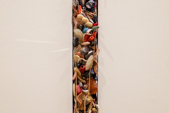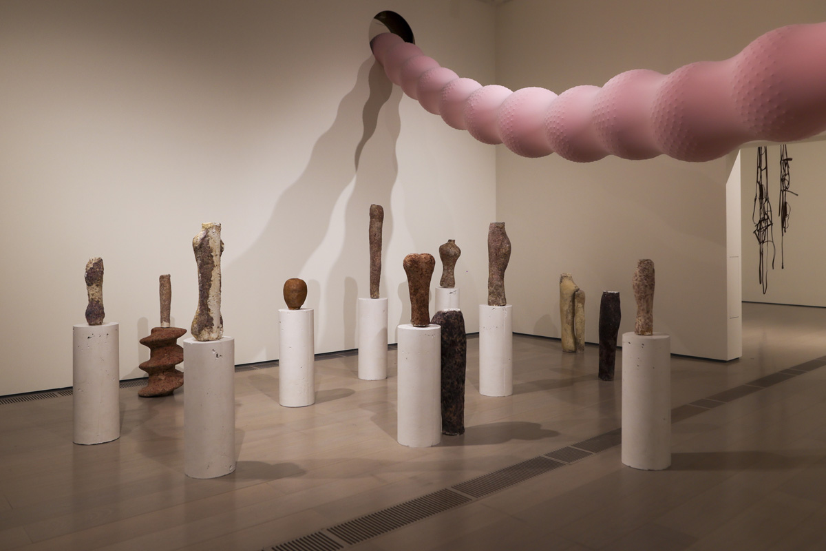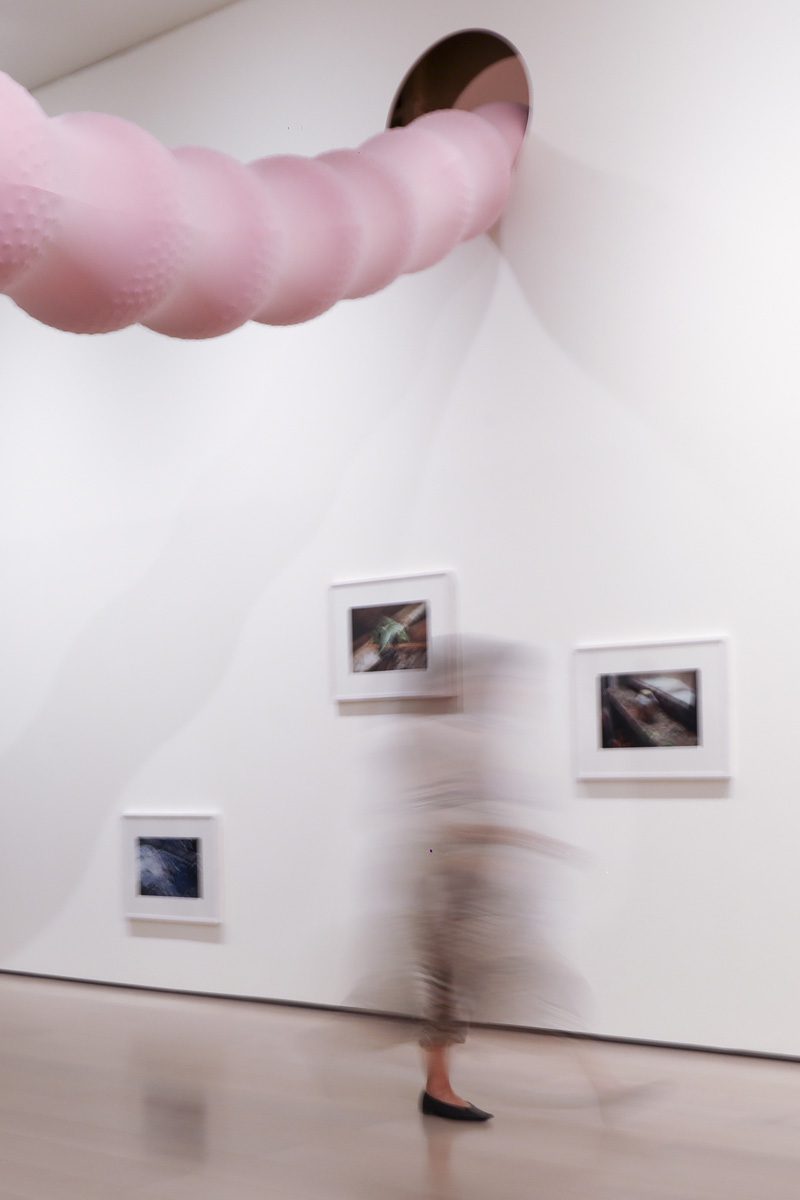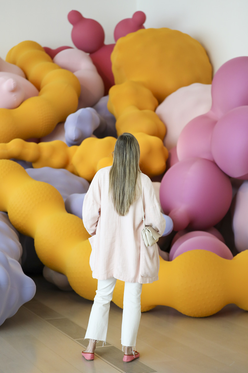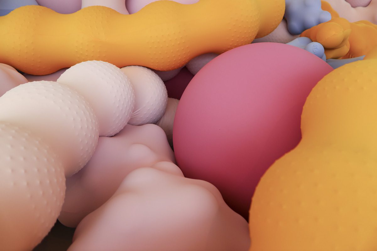 Concebida para esta exposición y producida con la colaboración del MACBA, en la muestra sorprende especialmente Oozing (rezumamiento), una acumulación de esculturas hinchables ante la que el visitante se vuelve minúsculo. Parece que esté siendo testigo de un incontrolable crecimiento orgánico, un enredo simbiótico entre obras-cuerpos, formas, materiales y colores que provienen de mundos desconocidos, que pueden llevar a paisajes fantásticos y de ciencia ficción, y que recuerdan a los órganos internos. Oozing se puede acariciar (eso sí, con cuidado), sincronizar nuestra respiración con la suya, sentir su piel como extensión de la nuestra en un ejercicio de comunión tan bello como extraño.