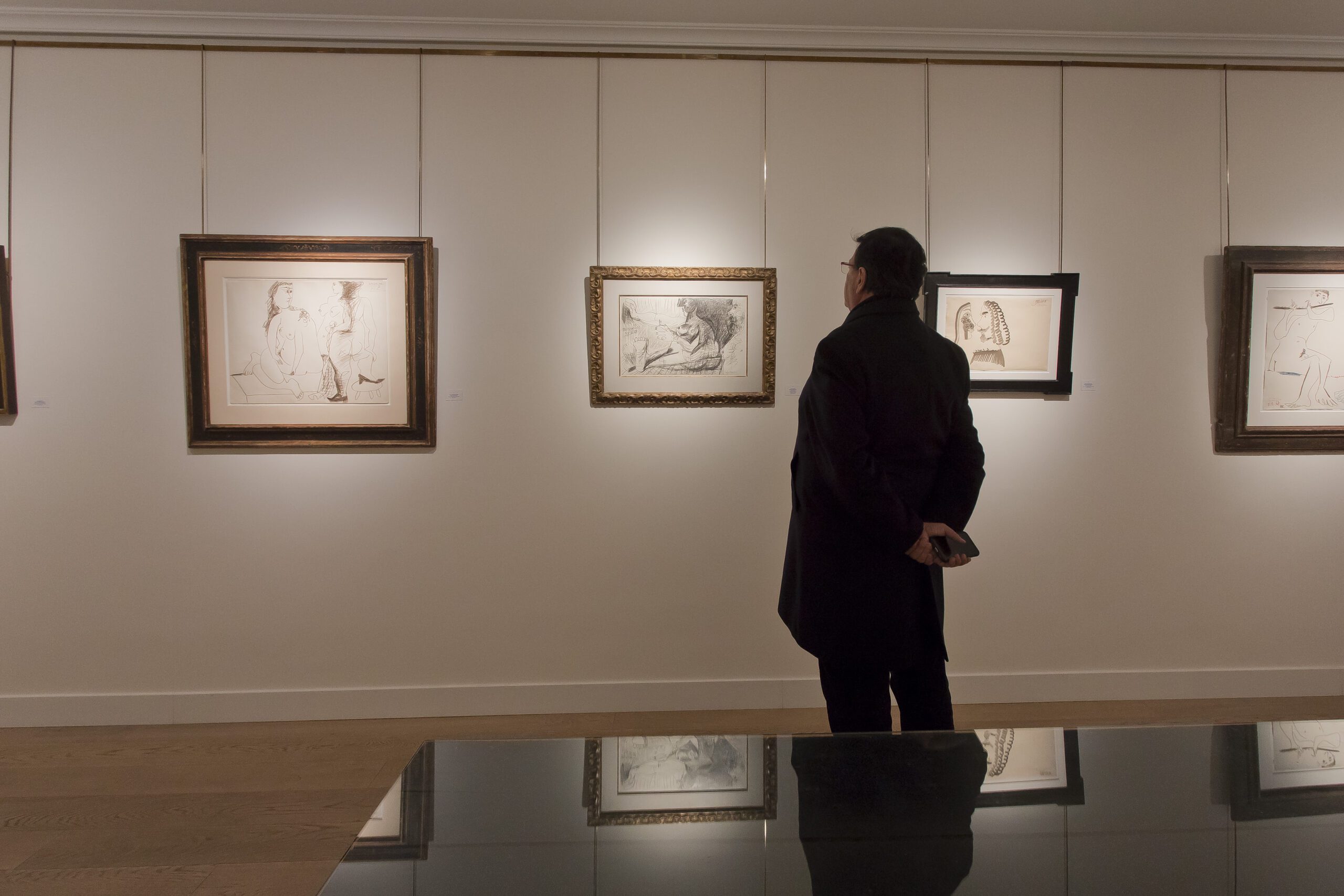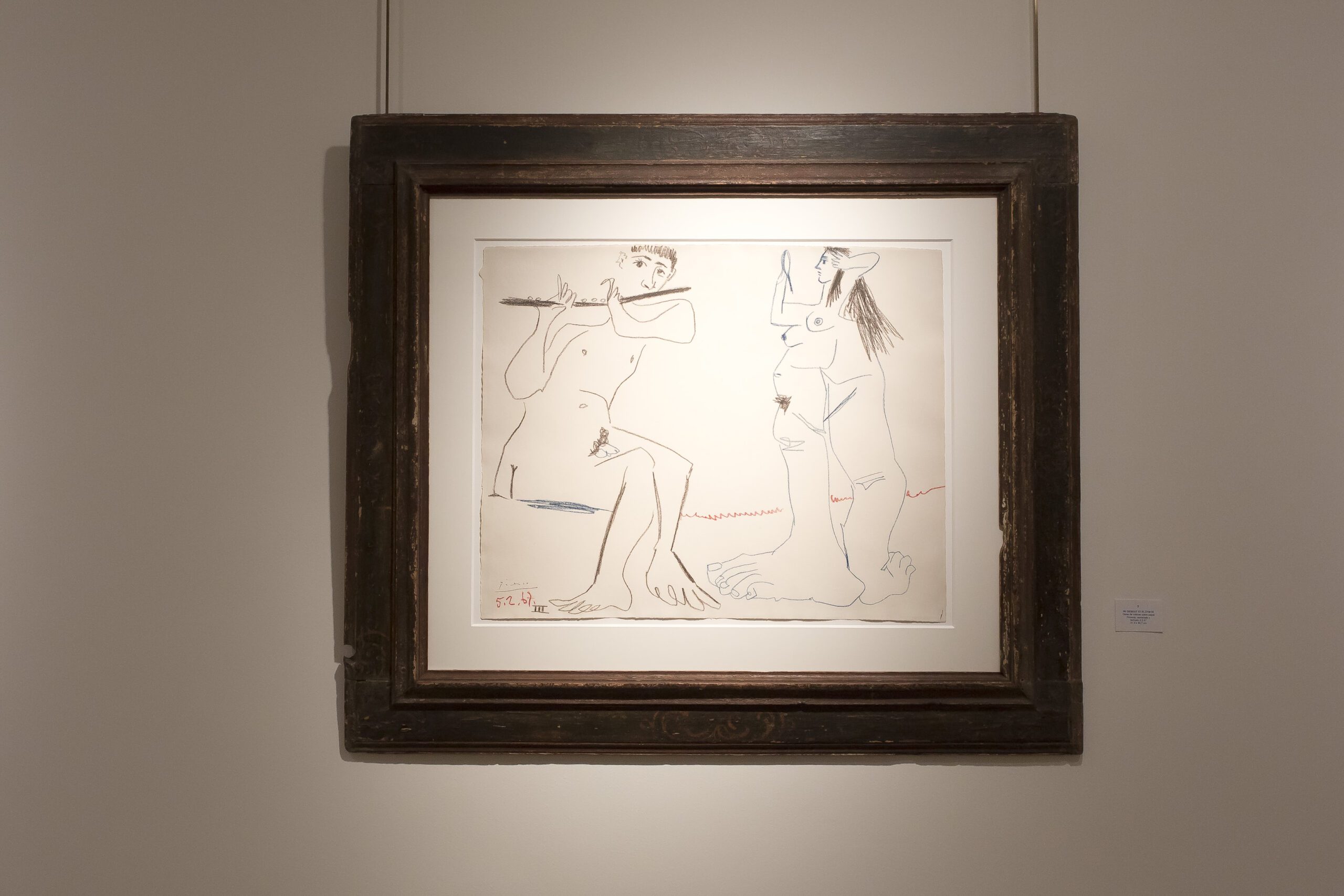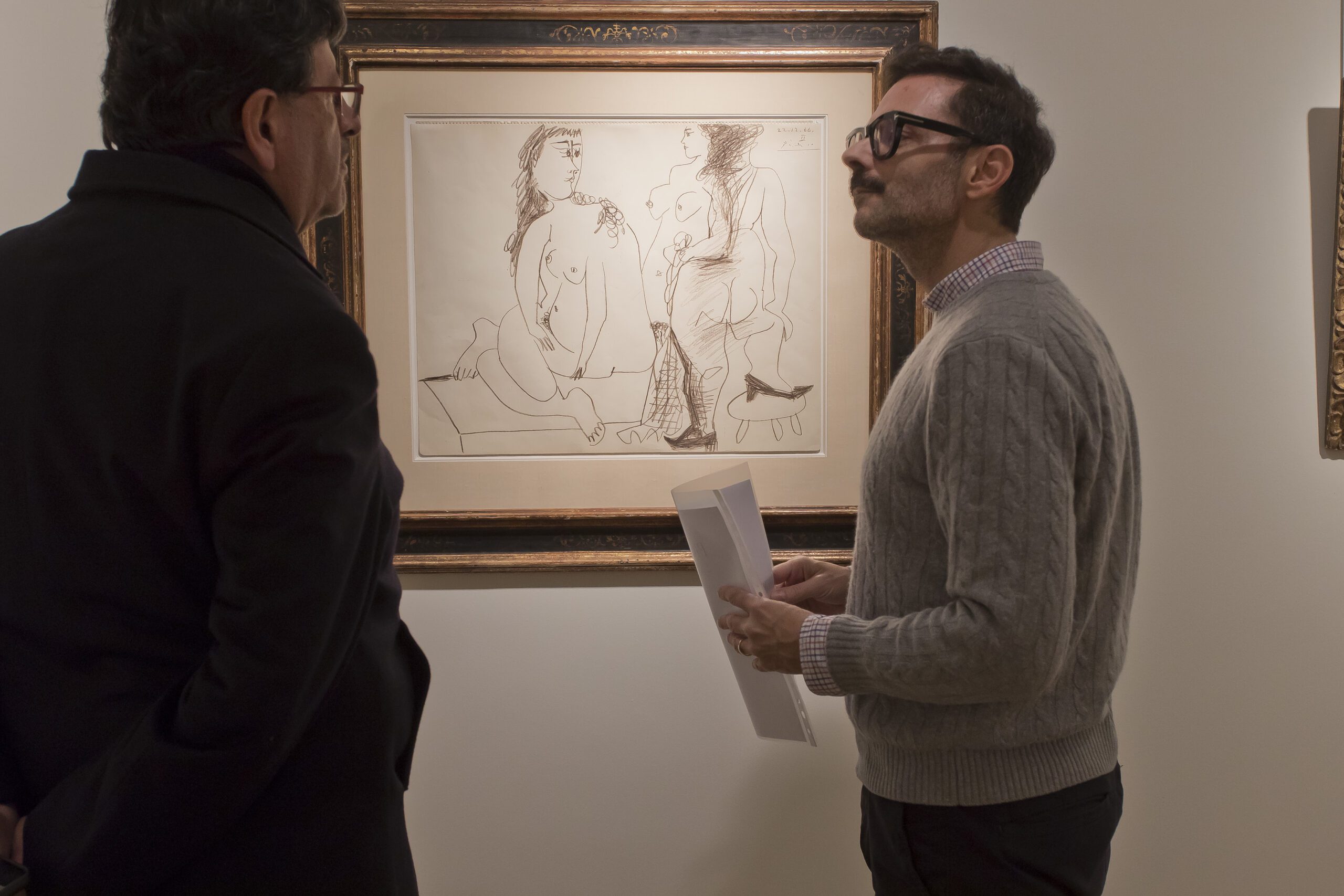 Entre las obras expuestas destacan un bodegón al óleo de la etapa cubista sintética, de 1922, y una escultura cerámica (pieza única) de 1956. El grueso de la muestra lo configuran 10 dibujos de temáticas diversas, entre los que sobresalen Deux femmes nues, fechado en 1966; Una cabeza de mosquetero, de 1967, y un dibujo a doble cara con el motivo del pintor y su modelo, de 1970. Este tema es recurrente a lo largo de la producción de Picasso, en el que la complicidad de ambos la protagoniza la mirada, el ojo del pintor, o de la pintora, como en el curioso dibujo Mujer pintora y modelo, fechado en 1954.