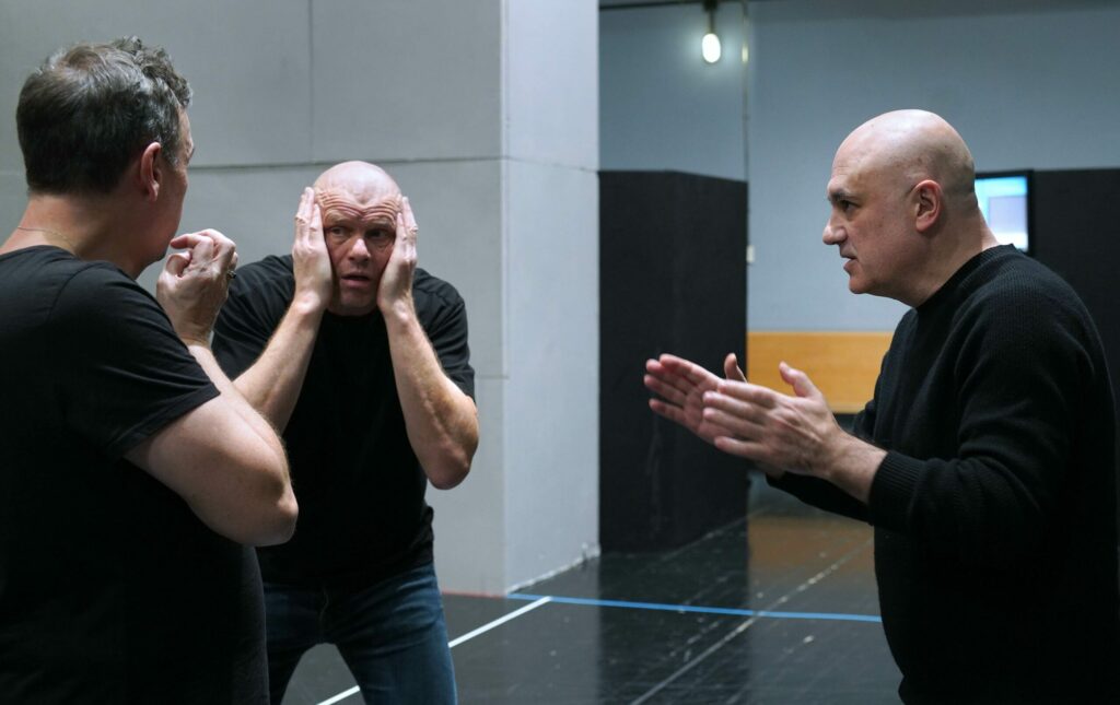 Bo Skovhus (El rey Lear), Calixto Bieito (director de escena) y, de espalda, Andrew Watts (Edgar). Foto: © Javier del Real | Teatro Real.