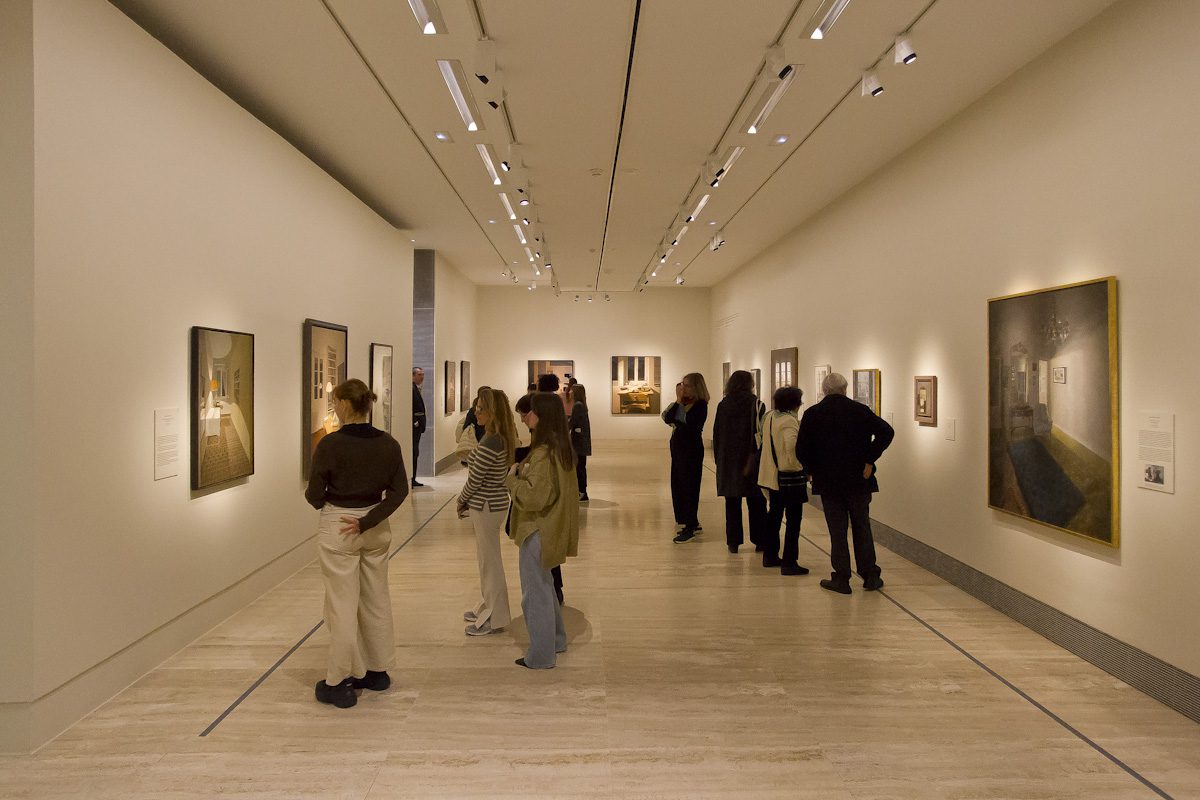 La siguiente sala se dedica a los interiores domésticos, que representa meticulosamente. Son espacios vacíos, sin presencia humana, en los que refleja las habitaciones de su domicilio o taller: el dormitorio, el salón, un pasillo, una ventana, el aseo… Con un simple desplazamiento de caballete, Quintanilla logra multiplicar los motivos pictóricos, reproduciendo la misma estancia desde un punto de vista diferente, como puede verse en Interior. Paco escribiendo (1995) y en Interior de noche (2003).