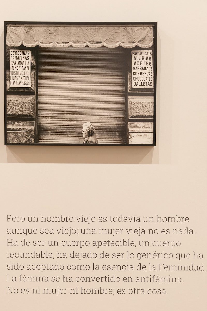 Antifémina reúne, además de diverso material documental y audiovisual, 94 de las 176 fotografías del libro, y su estructura obedece a los 10 capítulos en los que está estructurado y en los que se abordan, en tono crítico y didáctico, la vejez, el matrimonio, el trabajo, la religión, la prostitución, la cosificación, la marginación, las modelos, el disfraz y el piropo. Los textos de Maria Aurèlia Capmany (1918-1991) se disponen a lo largo de las paredes de la muestra para rendir también homenaje a su memoria y demostrar, lamentablemente, la validez de muchas de sus reflexiones.