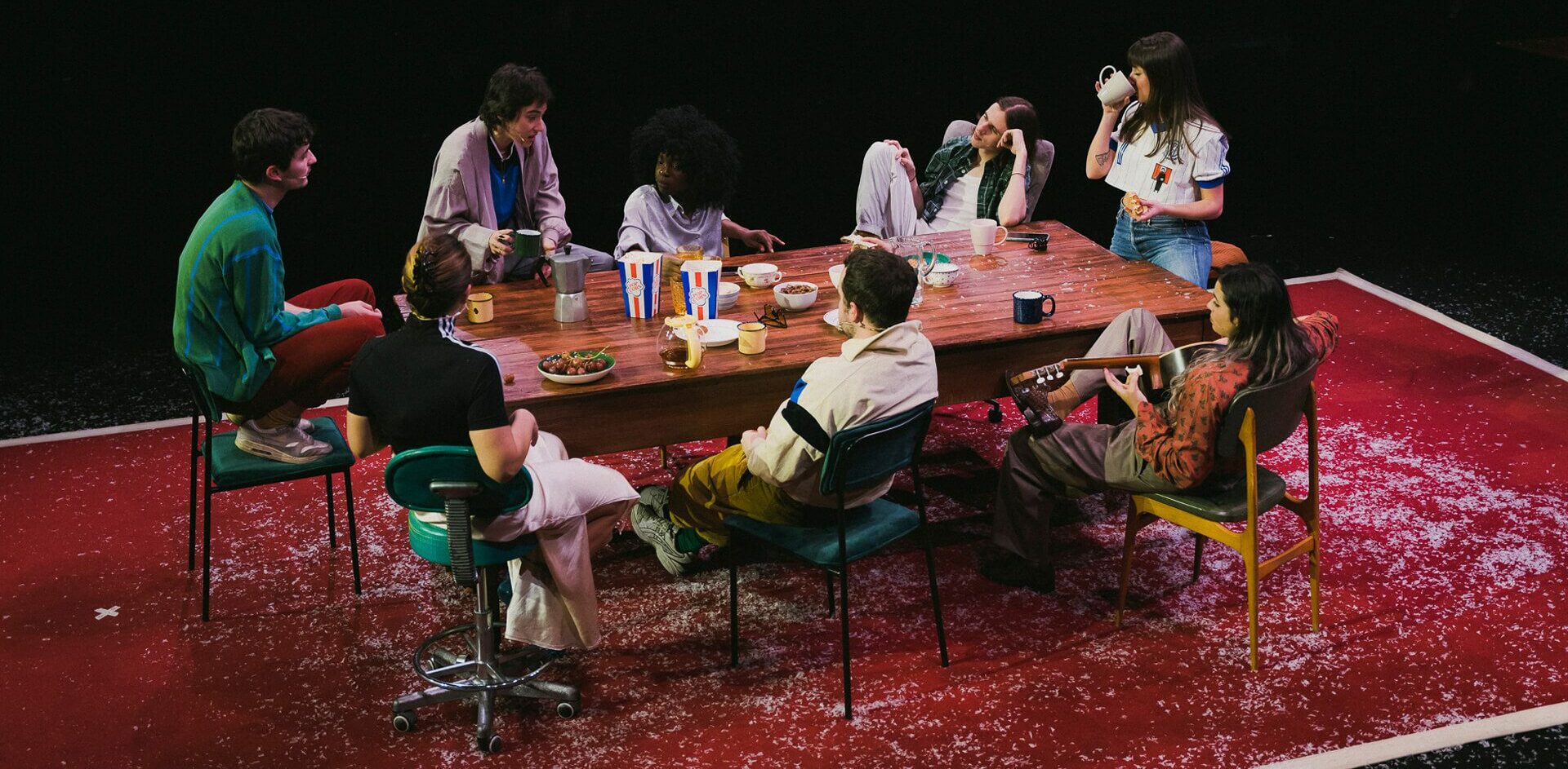La escenografía representa un estudio de grabación: a mi izquierda, la cabina de mezclas; a mi derecha, una pecera de sonido llena de instrumentos; en medio, un salón con sofás y un espacio que será ocupado por un ataúd de cristal, mesas para el desayuno o una alfombra sobre la que acercarse a la muerte o bailar. El despliegue de elementos no es pequeño. La luz de sala comienza a bajar y veo a los demás espectadores desaparecer poco a poco frente a mí. Empieza esta gran reunión.